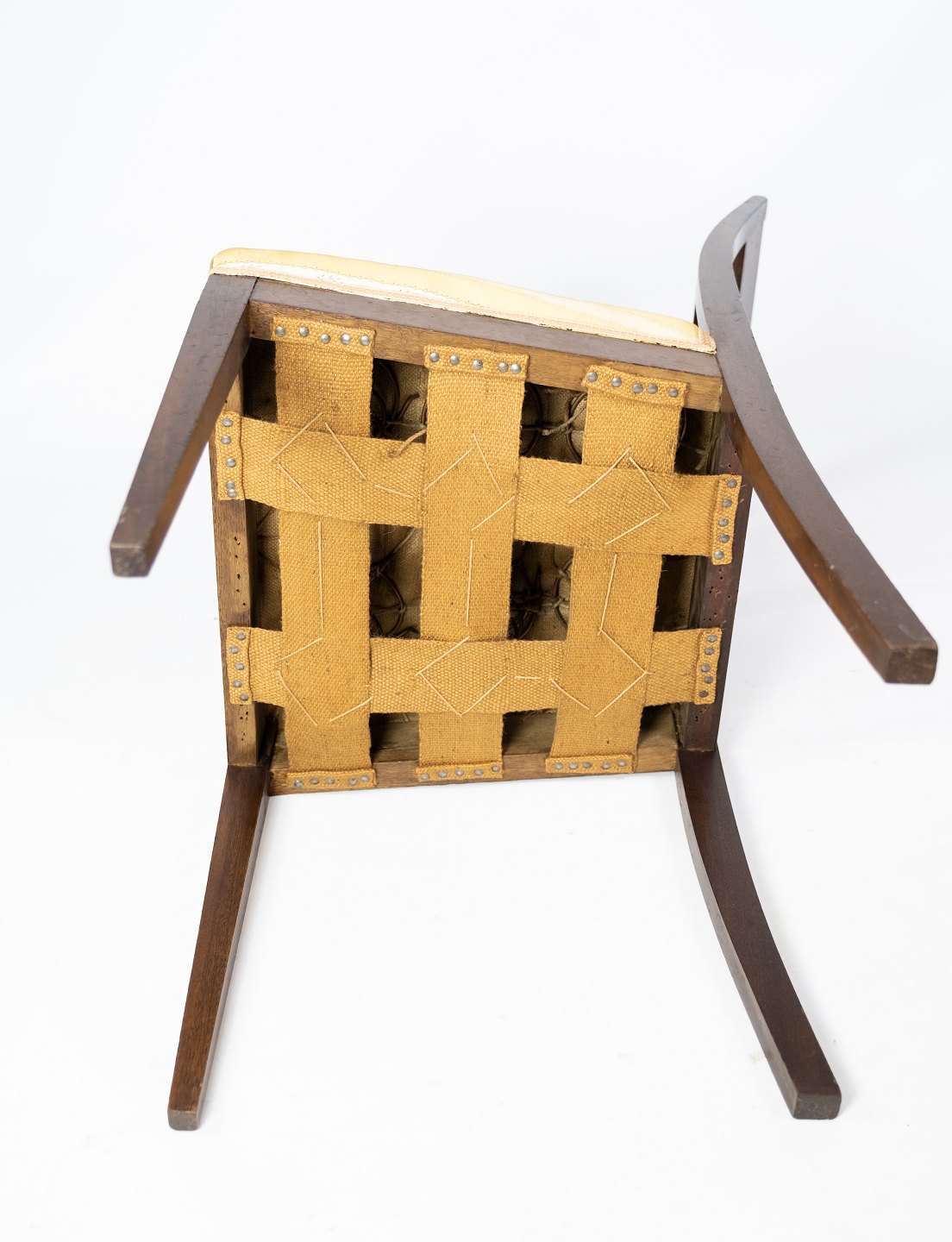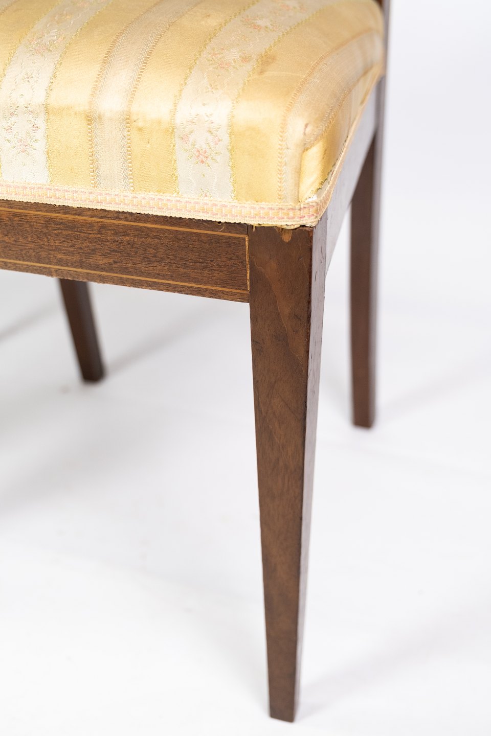 A pair of dining room chairs of mahogany with inlaid wood upholstered with light fabric from the 1920s.