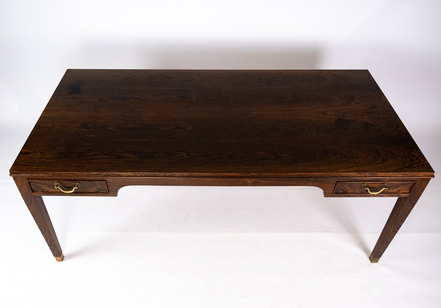 Bordet er fremstillet i palisander, et træ kendt for sine rige, dybe farver og smukke åremønstre. Palisanderens naturlige skønhed gør hvert bord unikt og tilføjer et strejf af luksus til ethvert rum. Bordets design er karakteriseret ved rene linjer og en minimalistisk form, hvilket giver det et tidløst udseende, der kan integreres i både moderne og klassiske interiører.