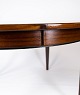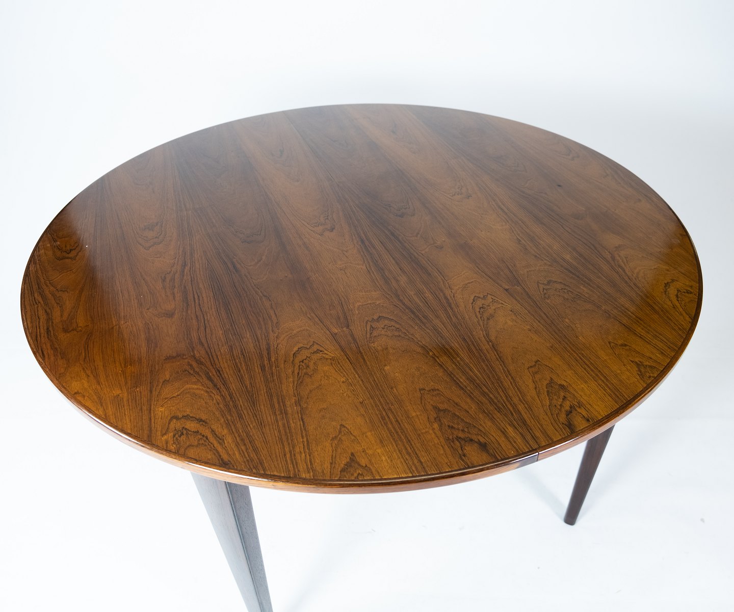 This rosewood dining table is a beautiful example of Danish design from the 1960s and is made by Omann Junior, a renowned Danish furniture manufacturer. The rosewood's characteristic warm tones and beautiful veins give the table a timeless elegance and a unique aesthetic appeal.