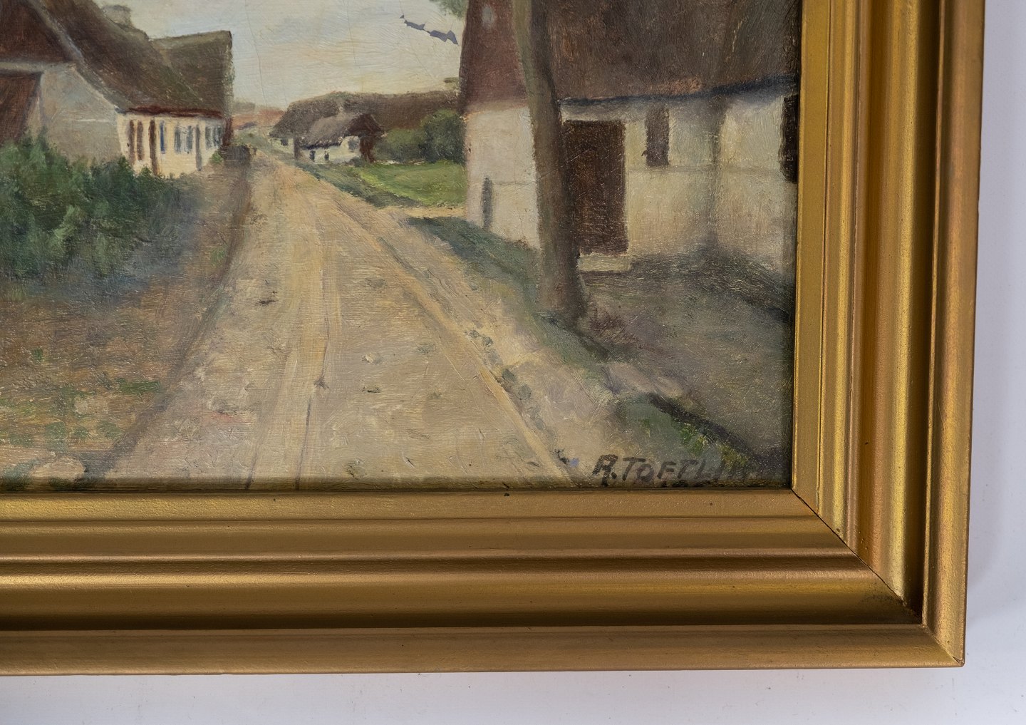 Oil painting with country motif and gilded frame, signed A. Toftlind.