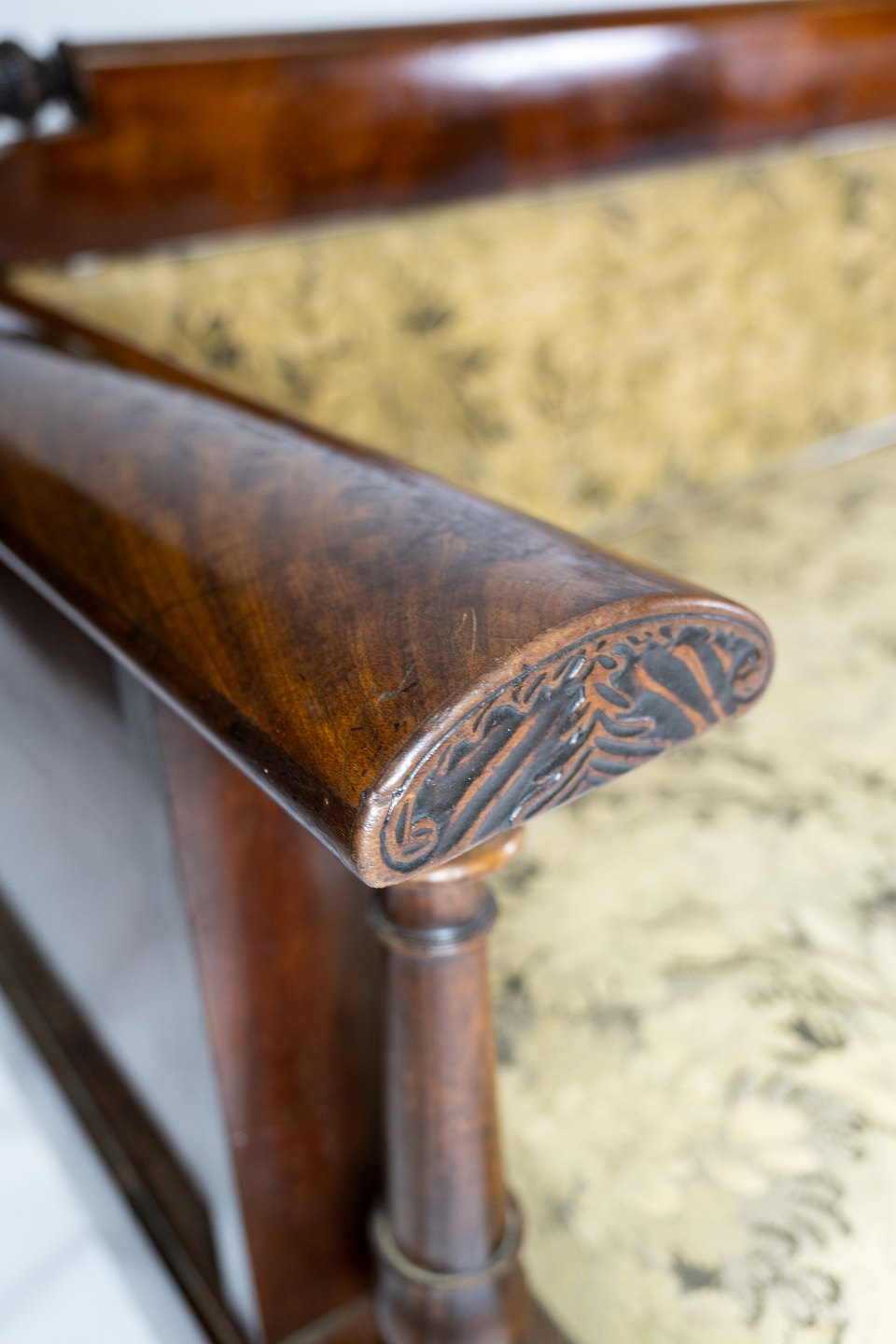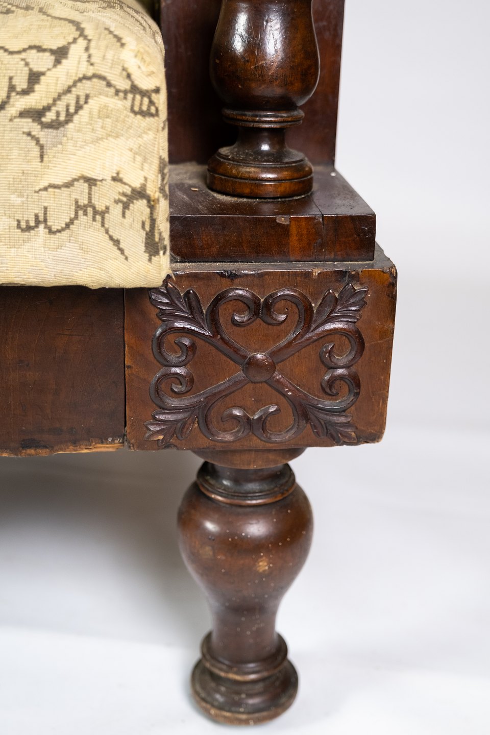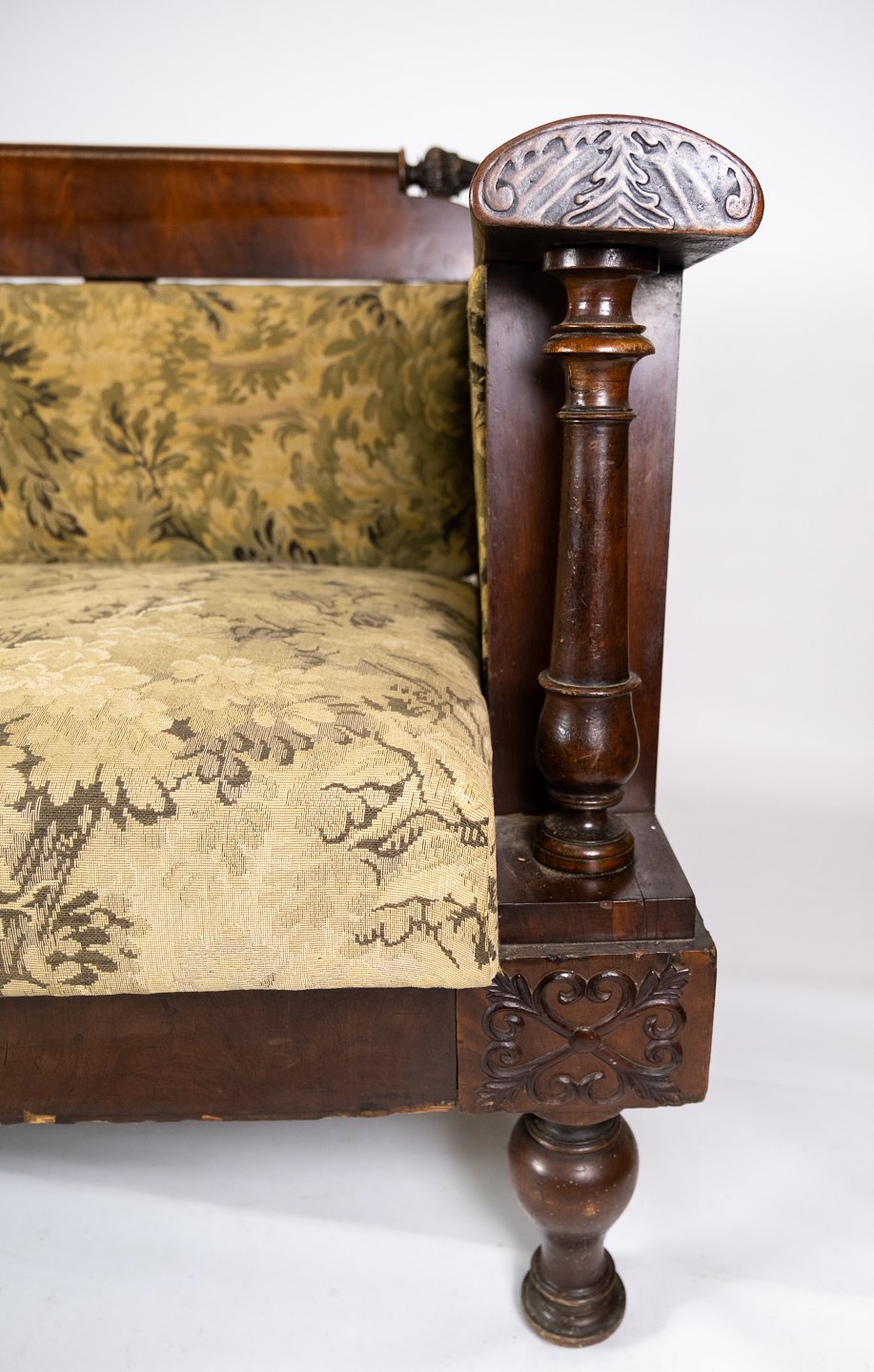 Late Empire sofa of mahogany and upholstered with light fabric, in great antique condition from the 1840s.
