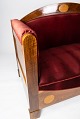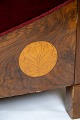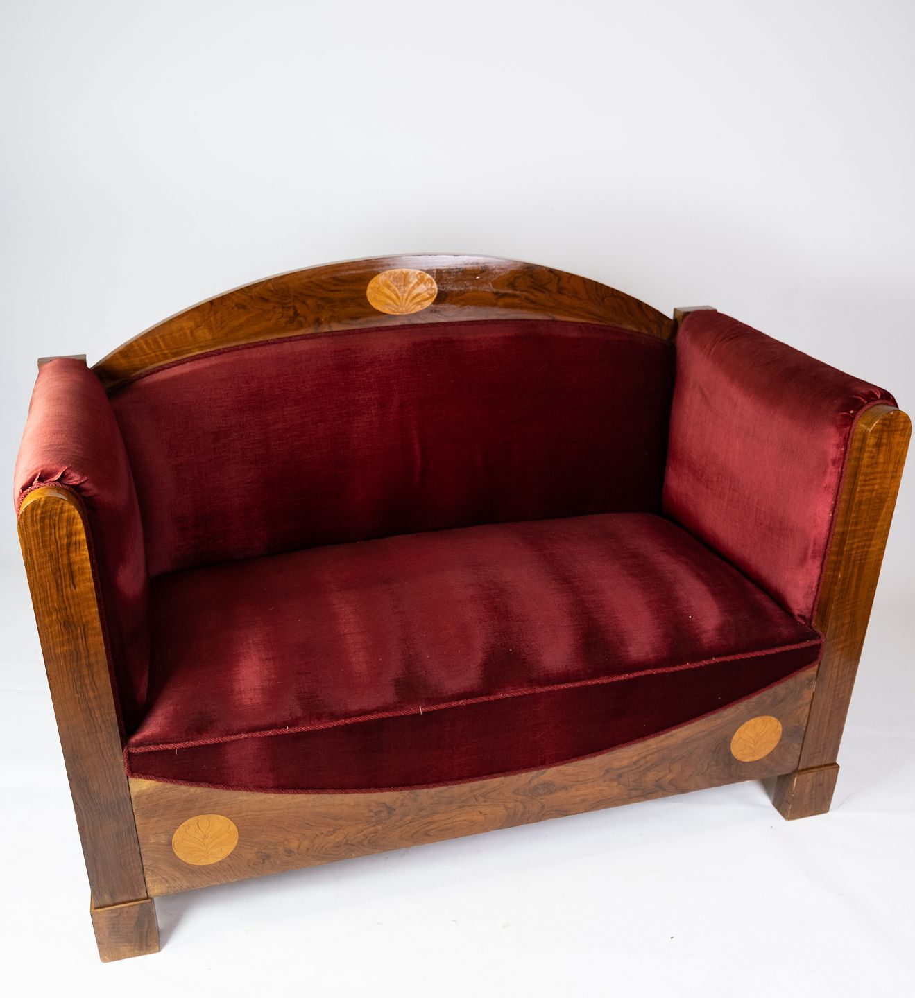 To personers sofa af valnød med intarsia og polstret med rød velour fra omkring 1910. Sofaen er i flot brugt stand.