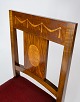 Sæt af fire spisestuestole af valnød med intarsia og polstret med rødt velour fra omkring 1910.