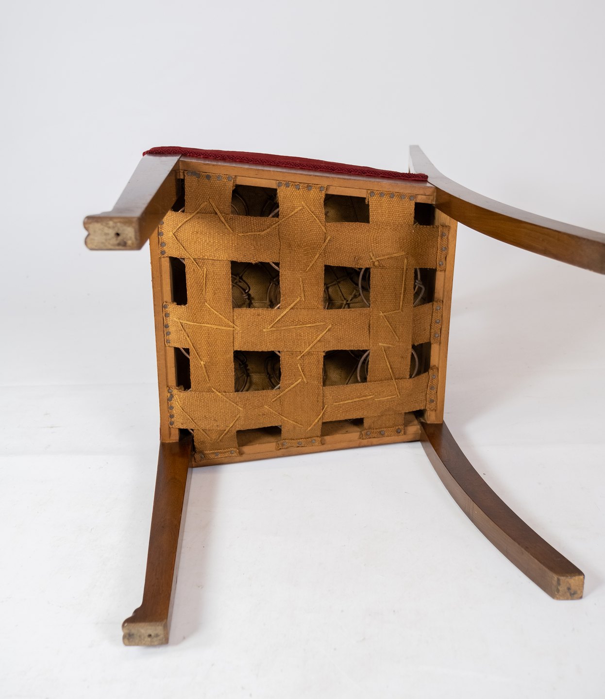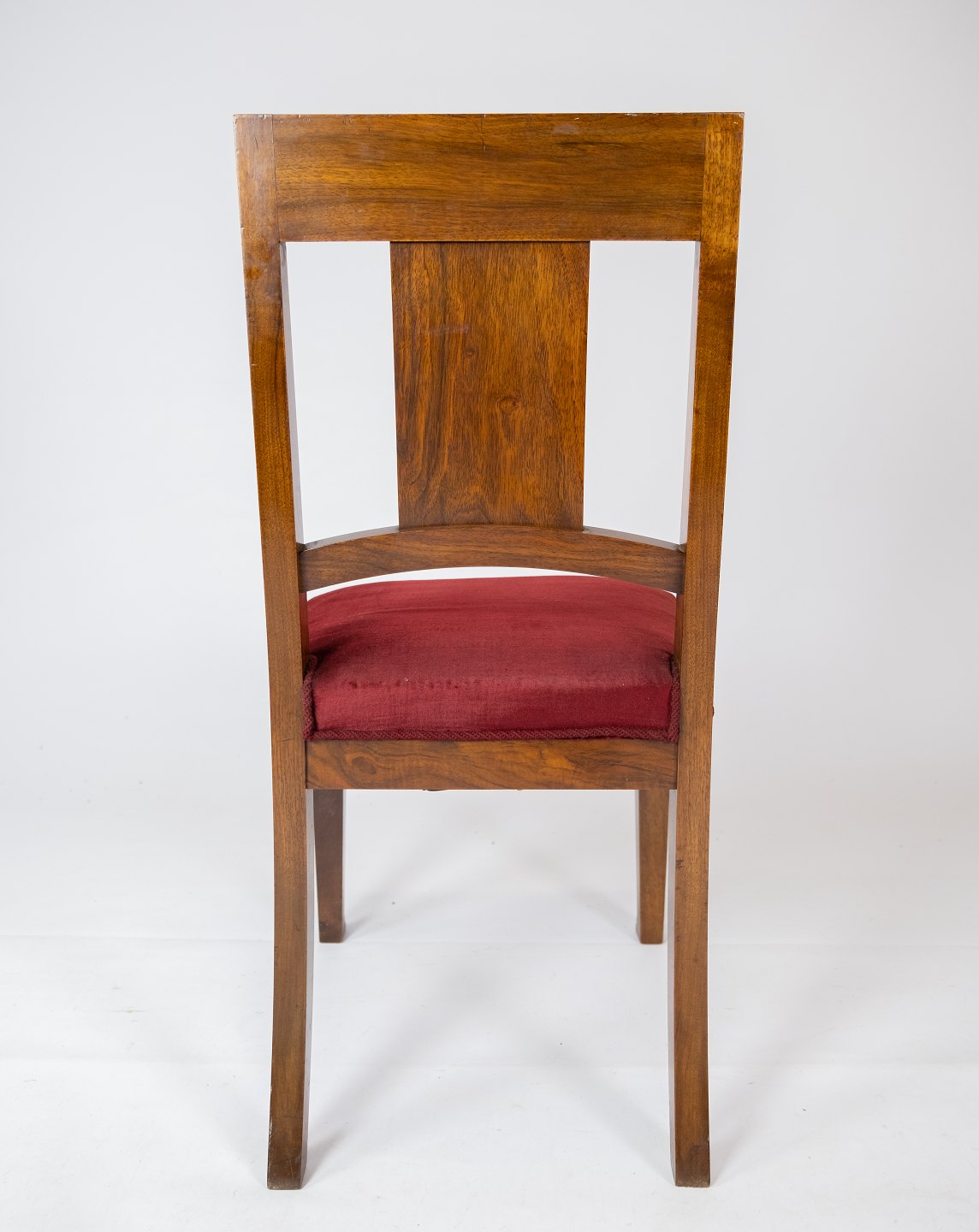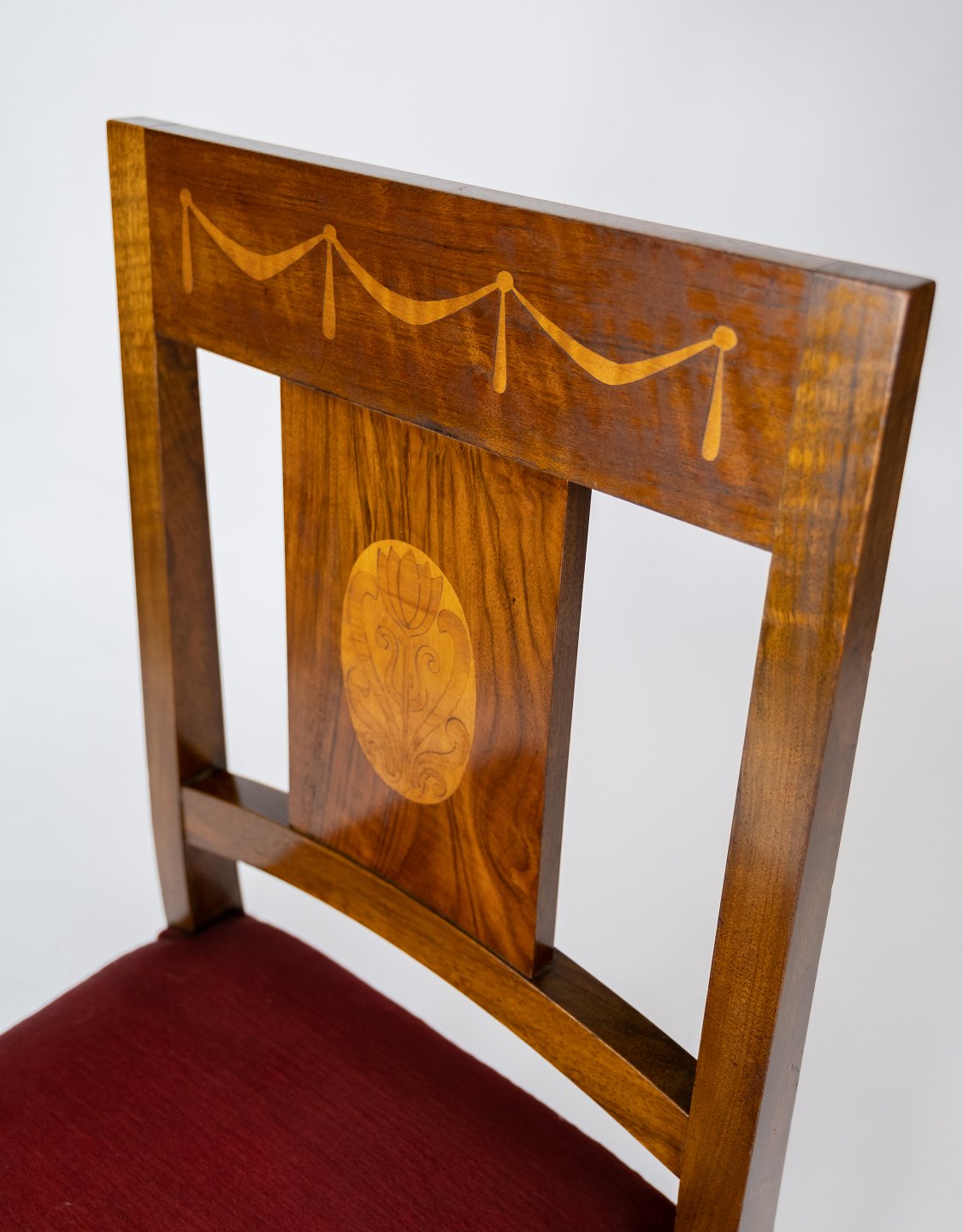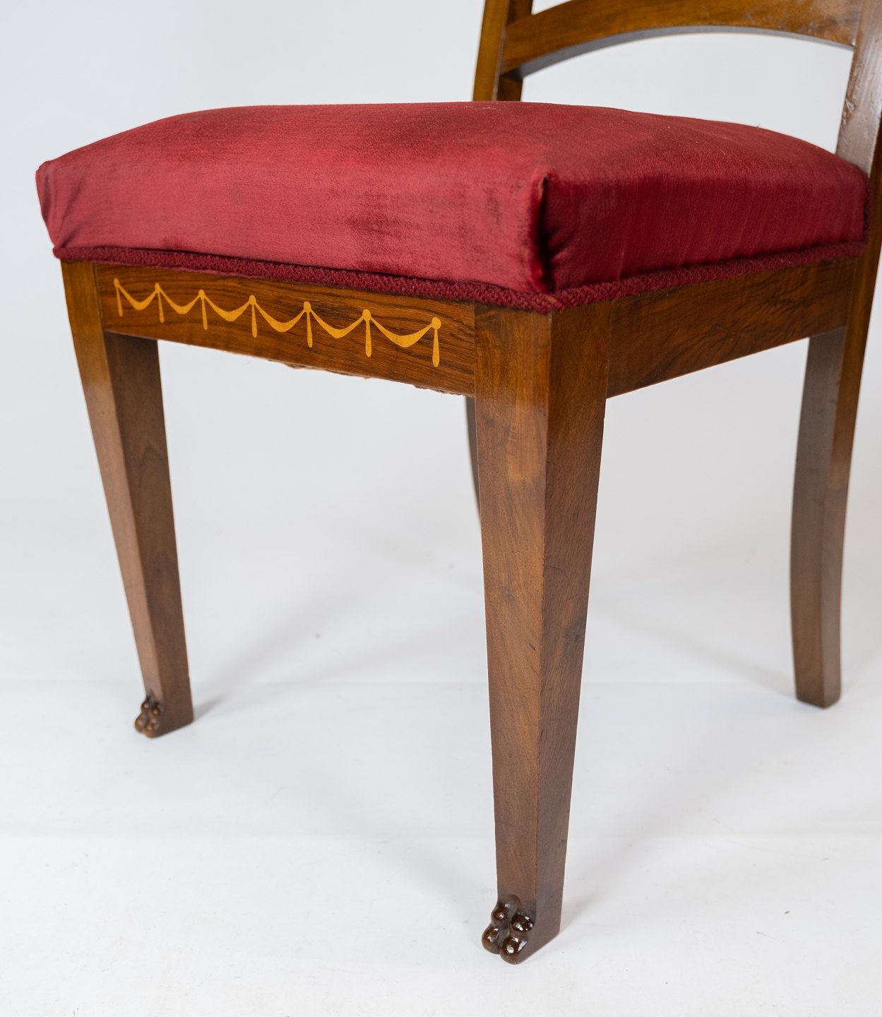 Sæt af fire spisestuestole af valnød med intarsia og polstret med rødt velour fra omkring 1910. Stolene er i flot brugt stand.