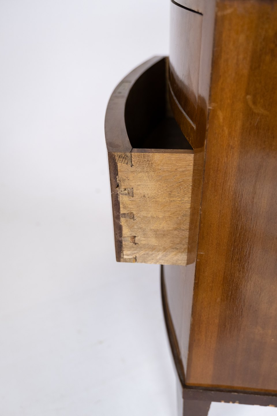 Buet kommode af mahogni og tre skuffer, i flot antik stand fra 1890erne.