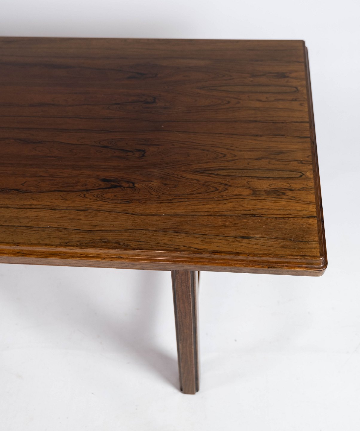 The coffee table is a beautiful example of Danish design from the 1960s, made of rosewood. It is a piece of furniture that exudes elegance and timeless beauty with its beautiful wooden structure and well-crafted details. Rosewood is known for its durability and rich colors, making it a popular choice among furniture makers of this era.