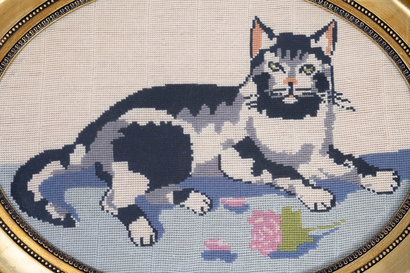 SoldEmbroidery with cat motif and with gilded frame from the 1930s.