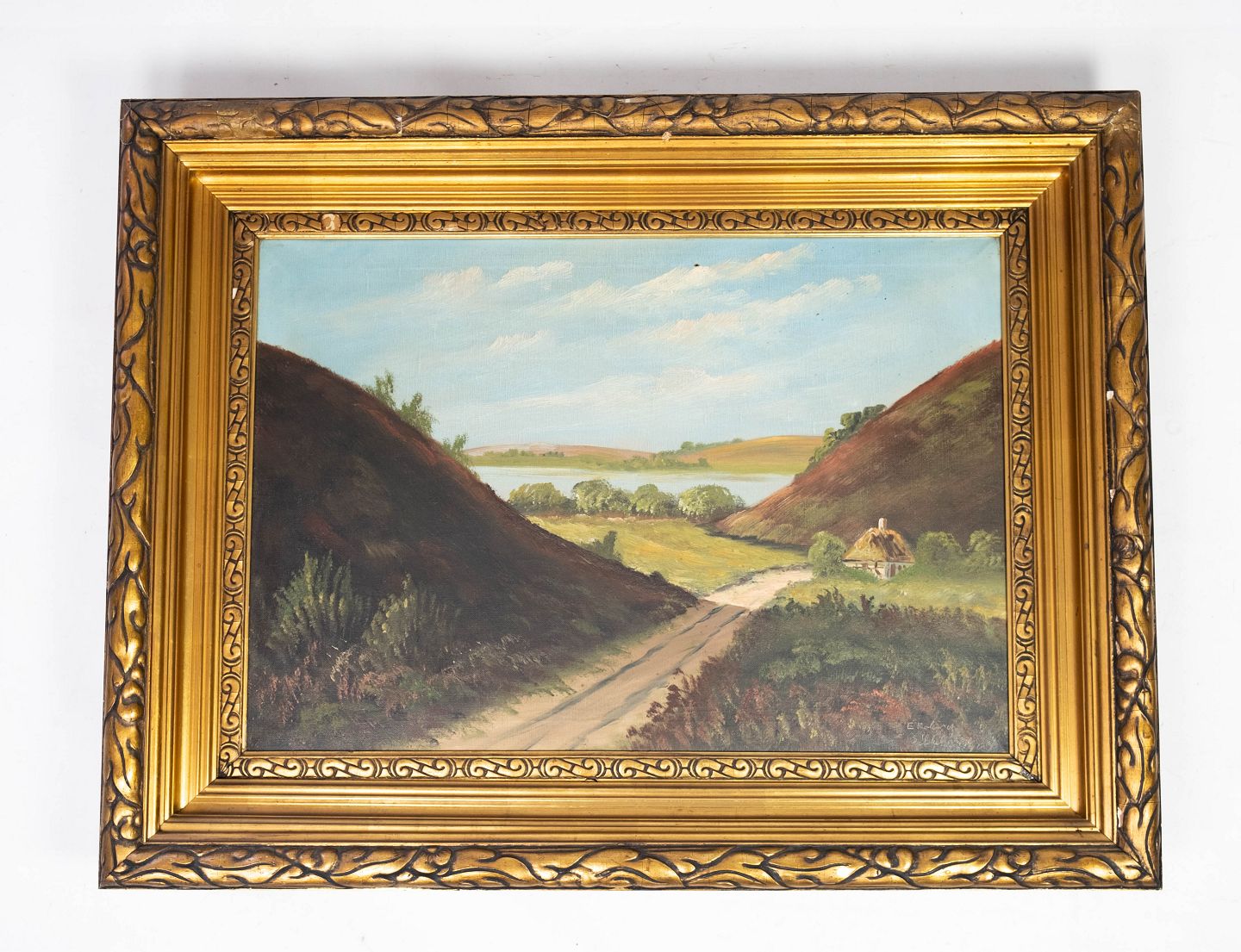 Oil painting with nature motif and gilded frame, unknown signature from the 1930s.