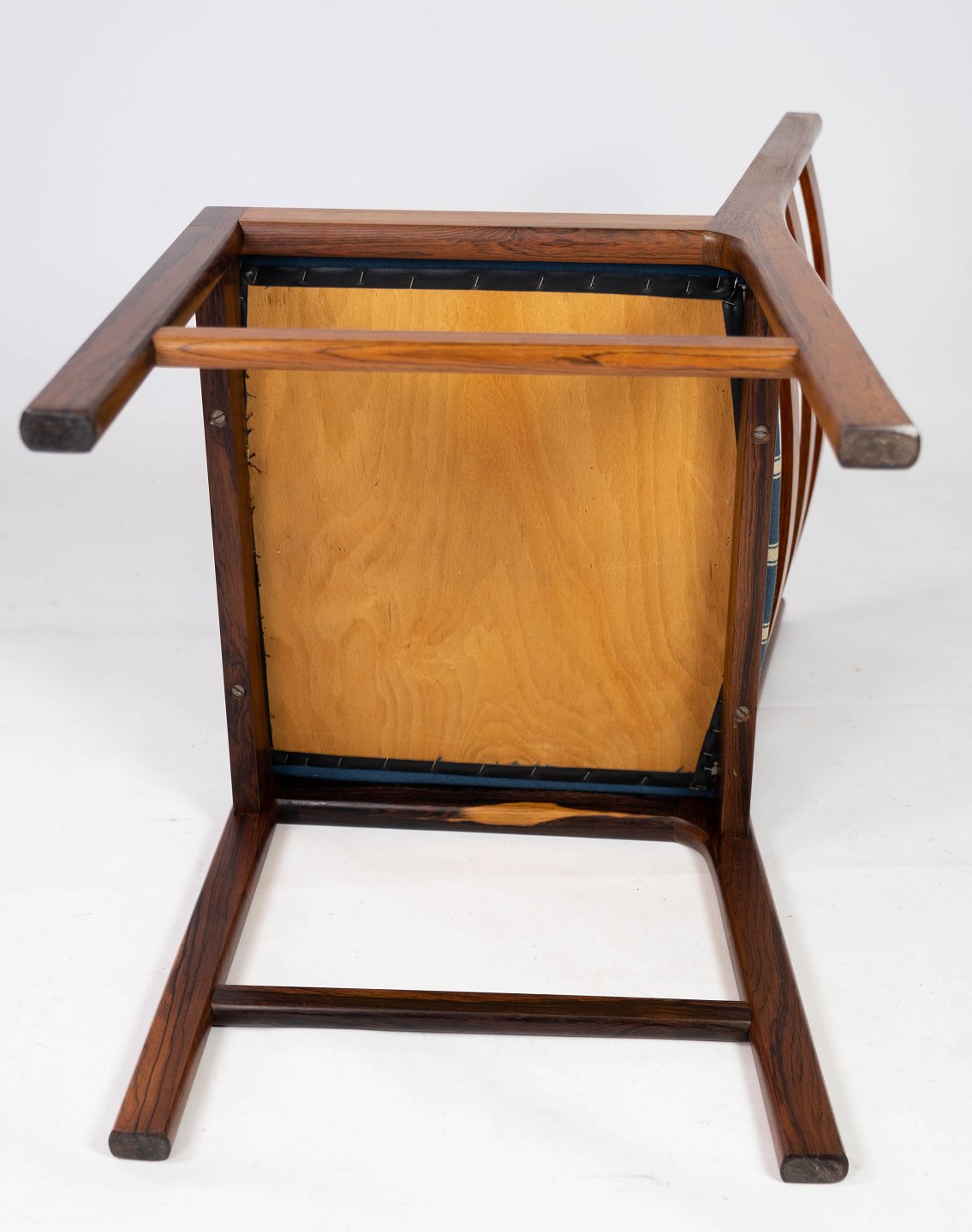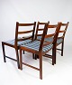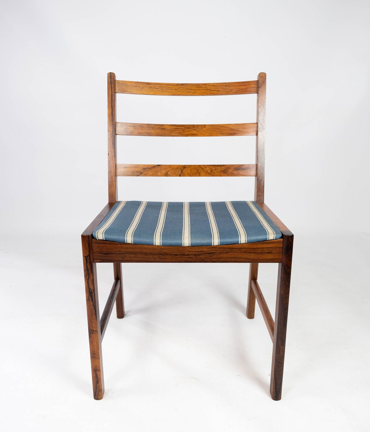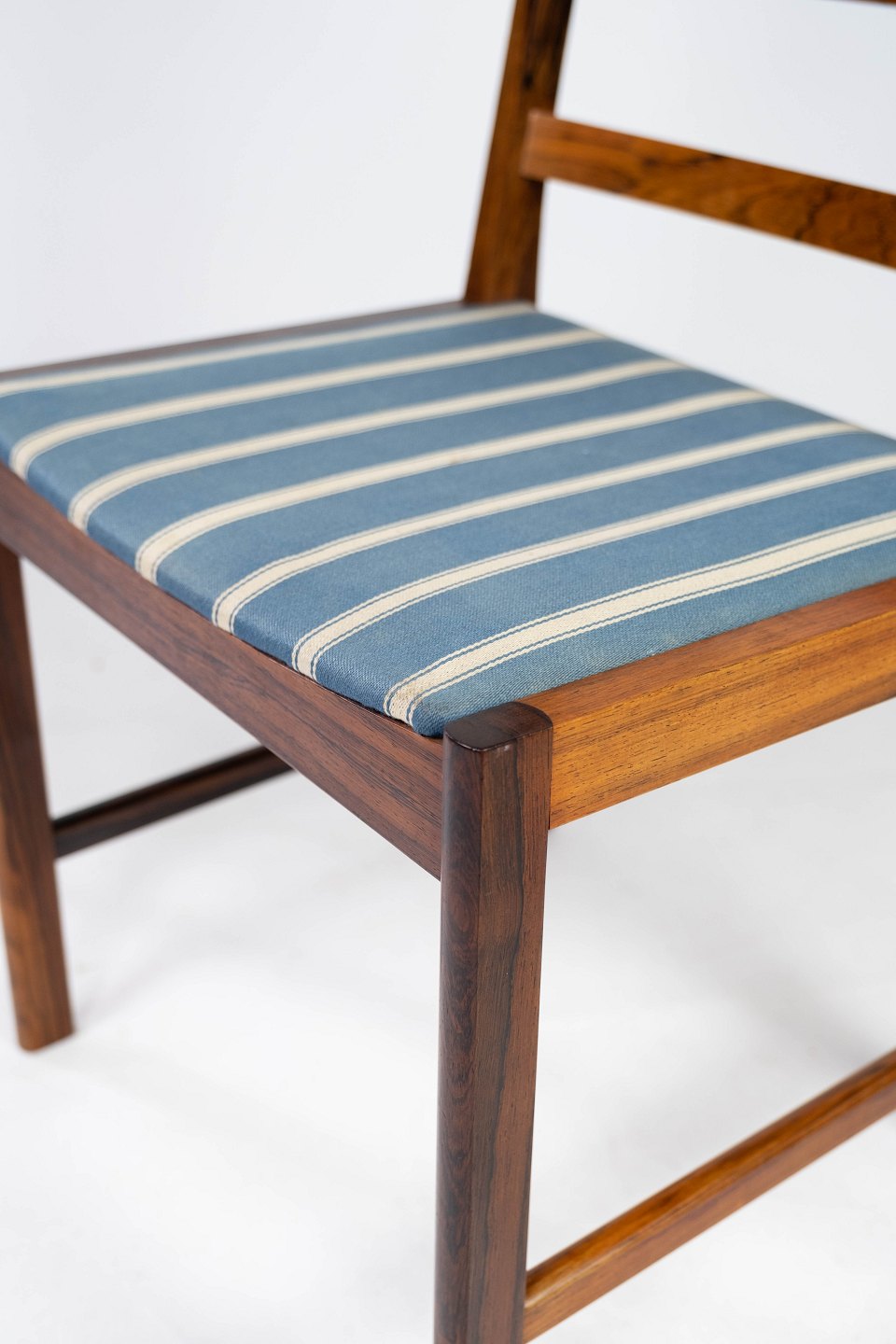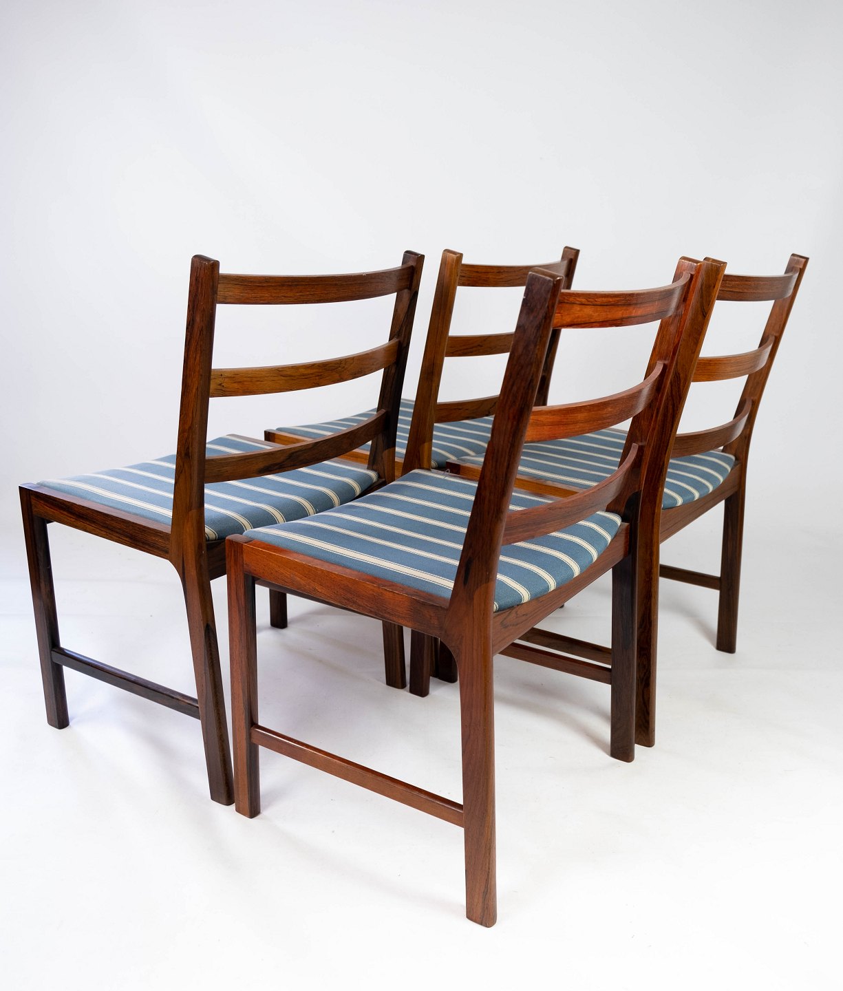 SoldA set of four dining chairs in rosewood and seats upholstered with blue striped fabric, of danish design from the 1960s. The chairs are in great vintage condition.
