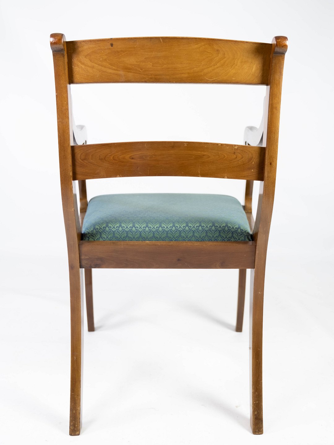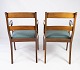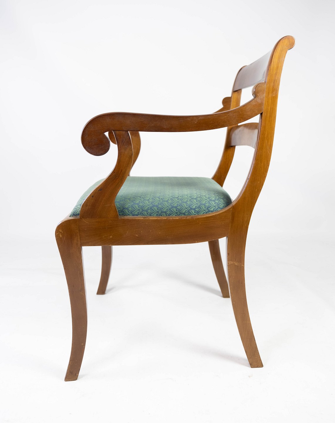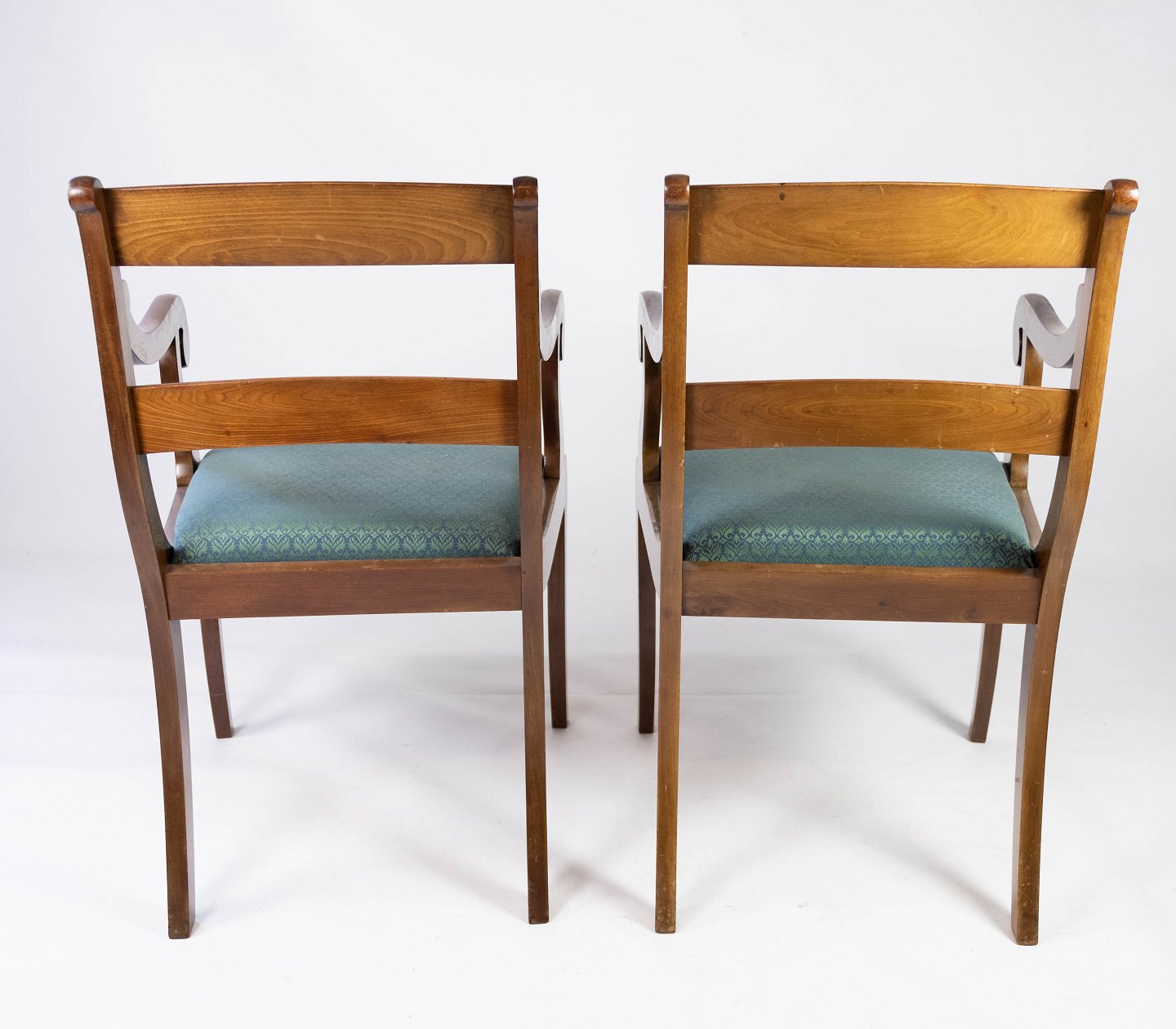 A pair of armchairs in mahogany and upholstered with dark fabric, both are in great vintage condition from the 1890s.