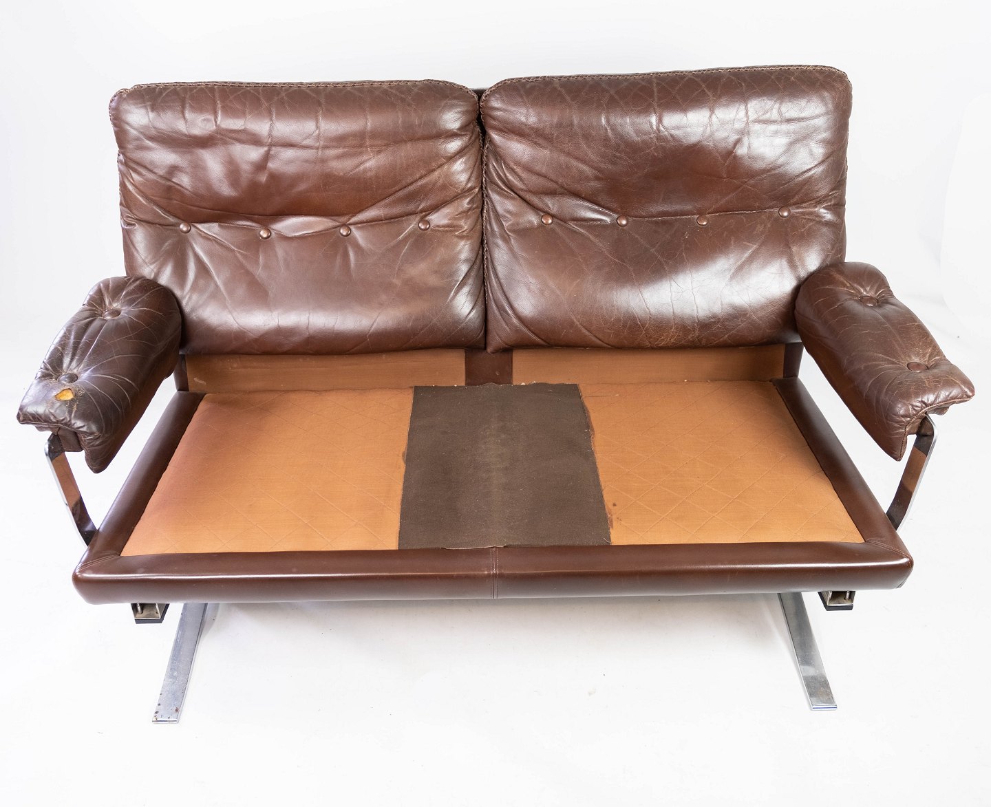 Denne to-personers sofa er et karakteristisk eksempel på Arne Norells design fra 1970'erne. Med sin polstring af patineret læder og metalstel udstråler sofaen en stilfuld og moderne æstetik. Trods sin alder er sofaen i flot brugt stand og tilbyder en behagelig siddeoplevelse. Denne sofa er et ideelt valg for dem, der søger en lækker og komfortabel møbel med en unik historie og en tidstypisk charme.