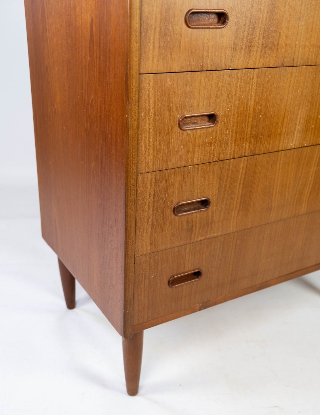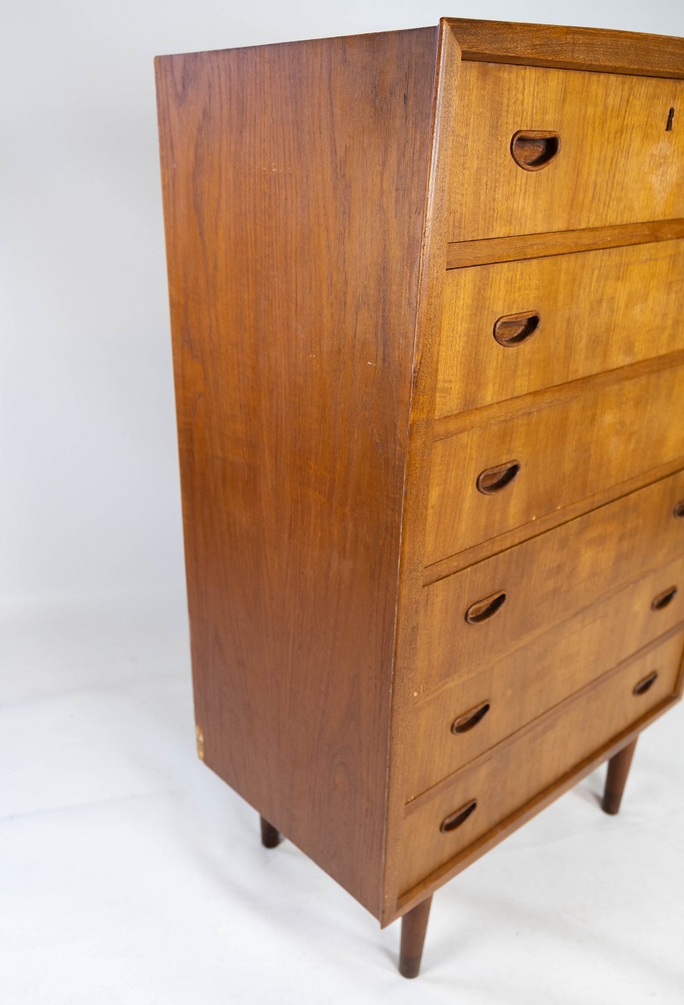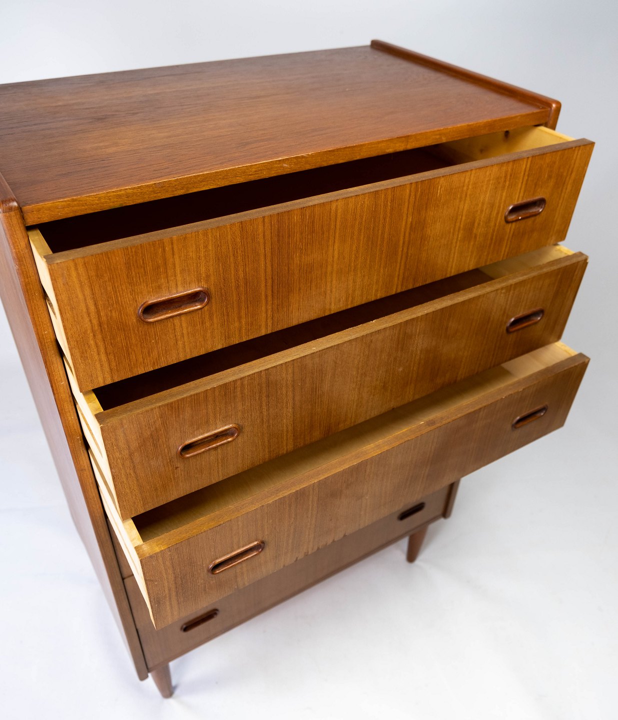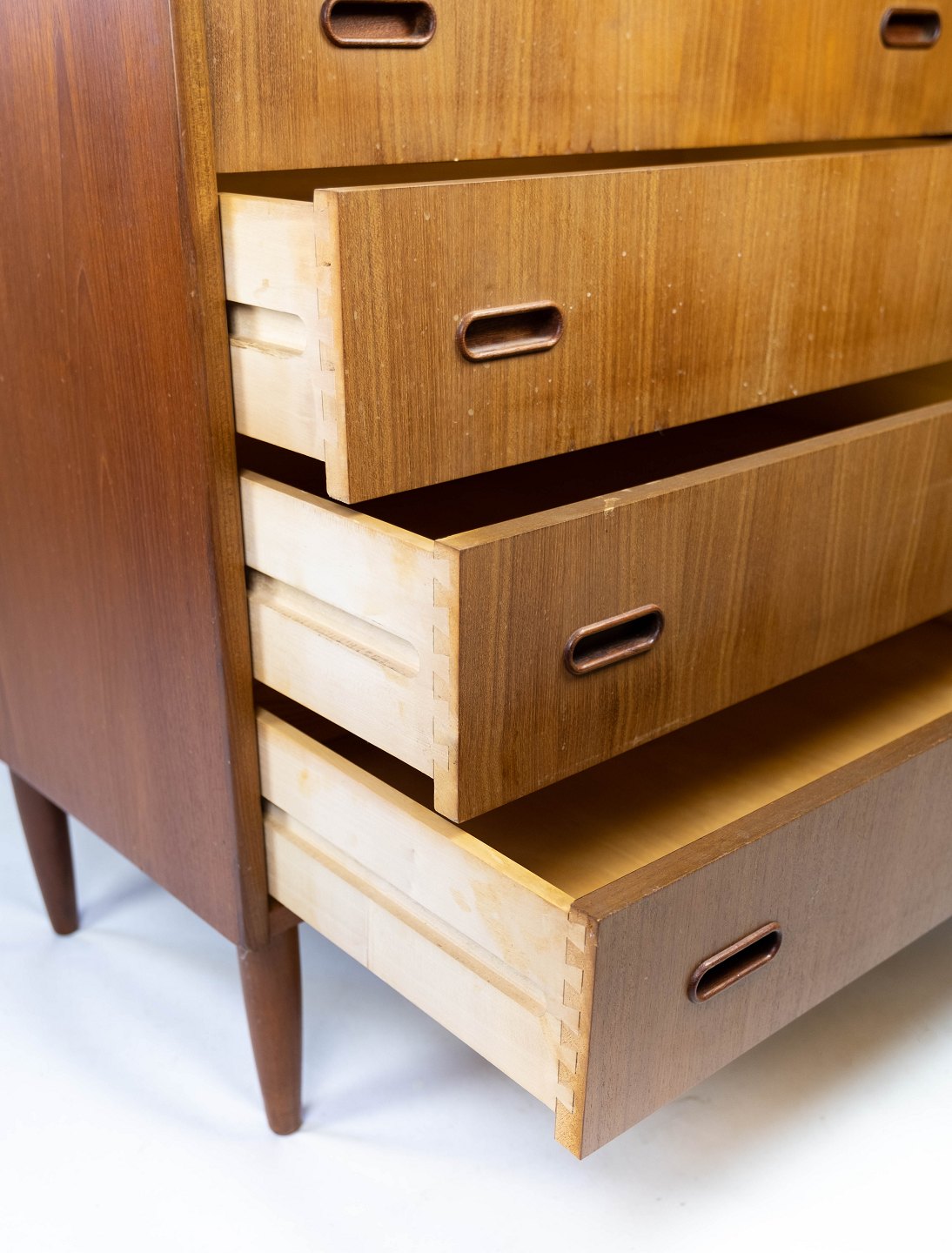 Denne kommode af teak, designet af danske håndværkere omkring 1960, er et klassisk eksempel på dansk møbeldesign fra denne æra. Teaktræet tilføjer en varm og naturlig tone til møblet og bringer samtidig en følelse af holdbarhed og tidløshed.