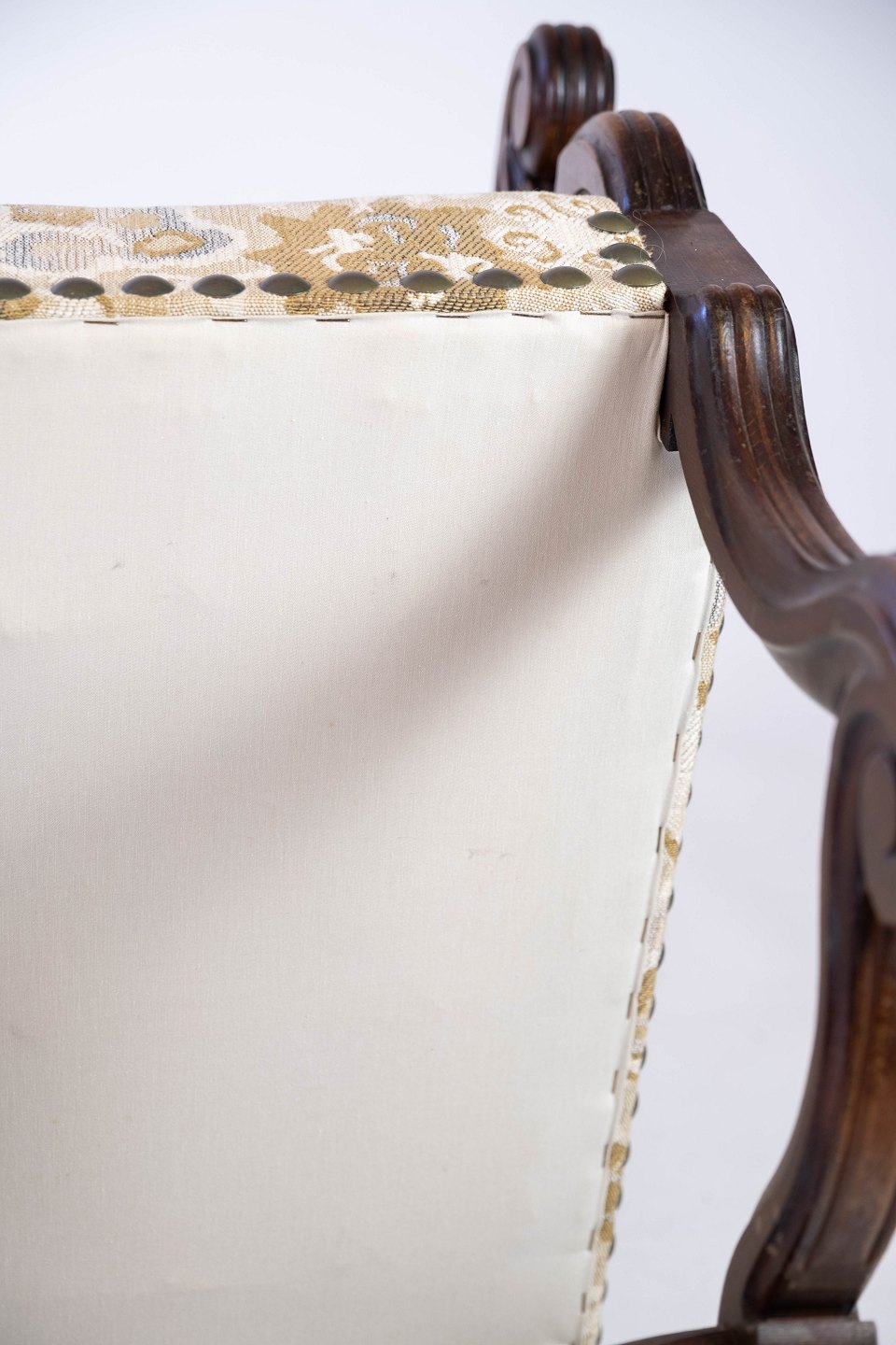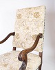 Armstol af mørk eg og polstret med lyst stof, i flot antik stand fra 1910.
