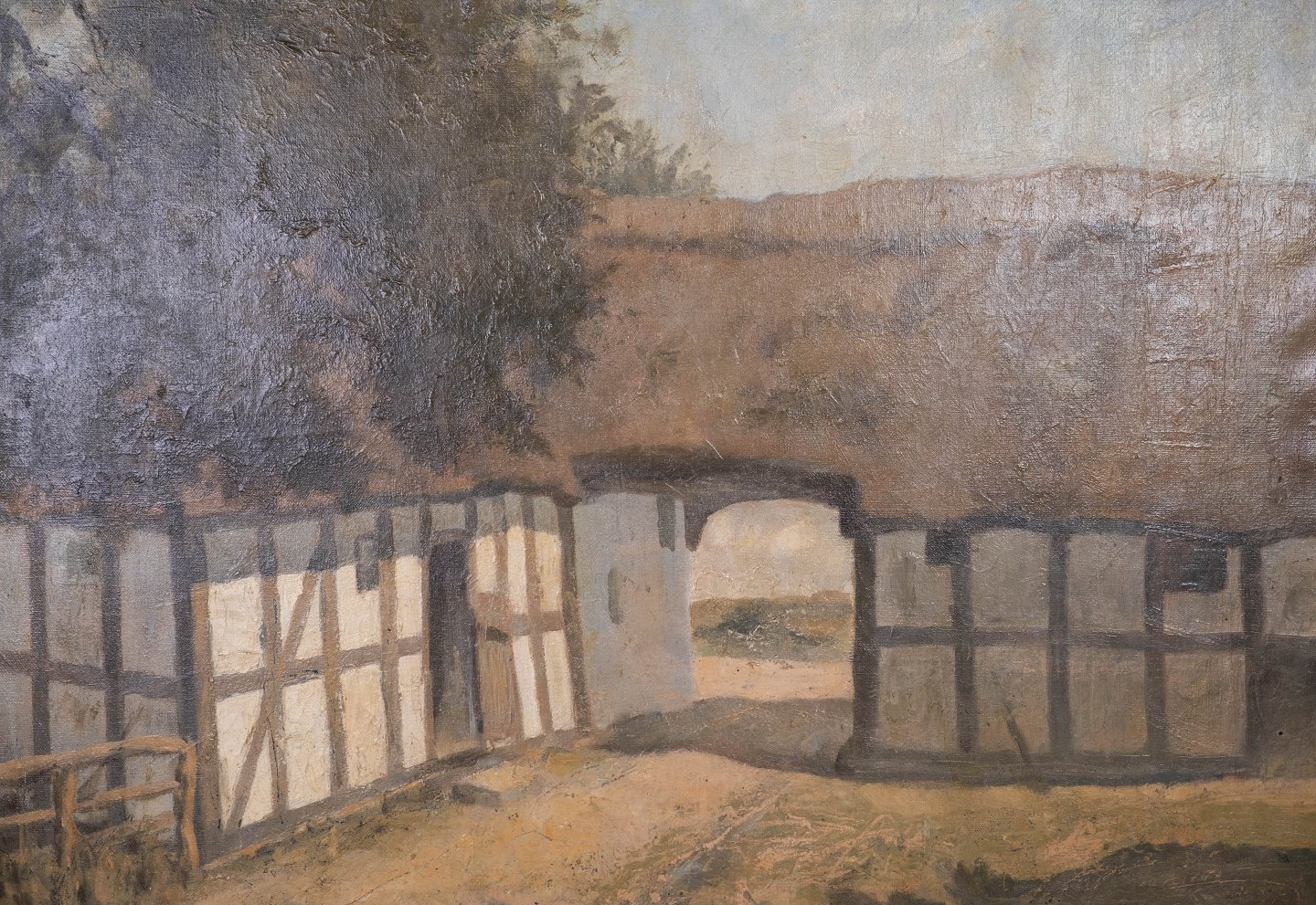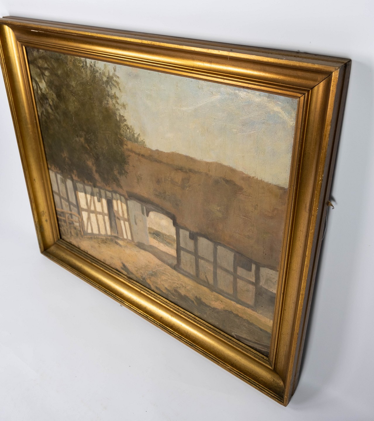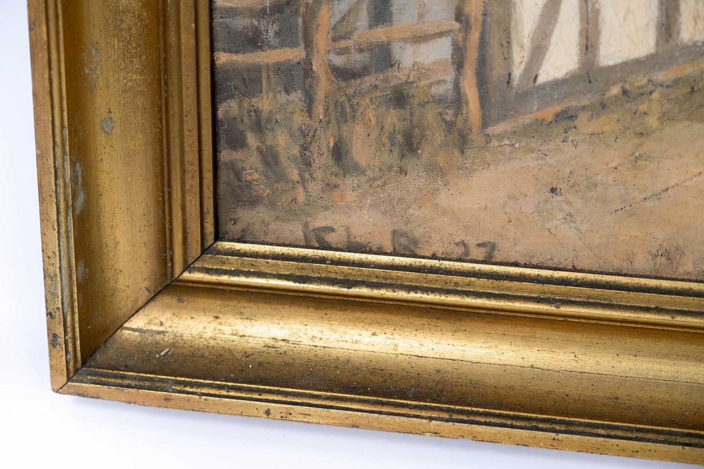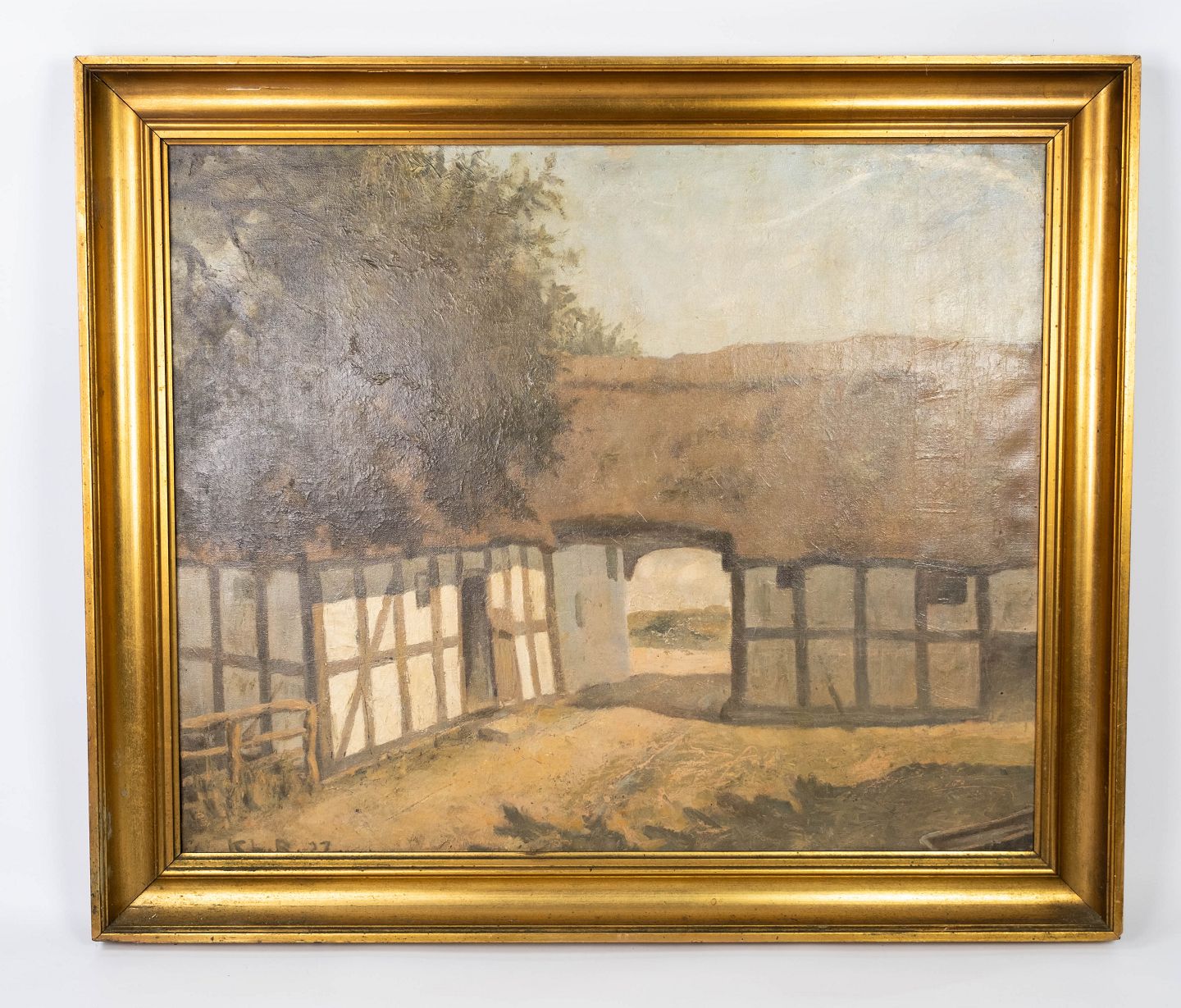 Oil painting with country side motif and gilded frame, signed K.L.R. 27.