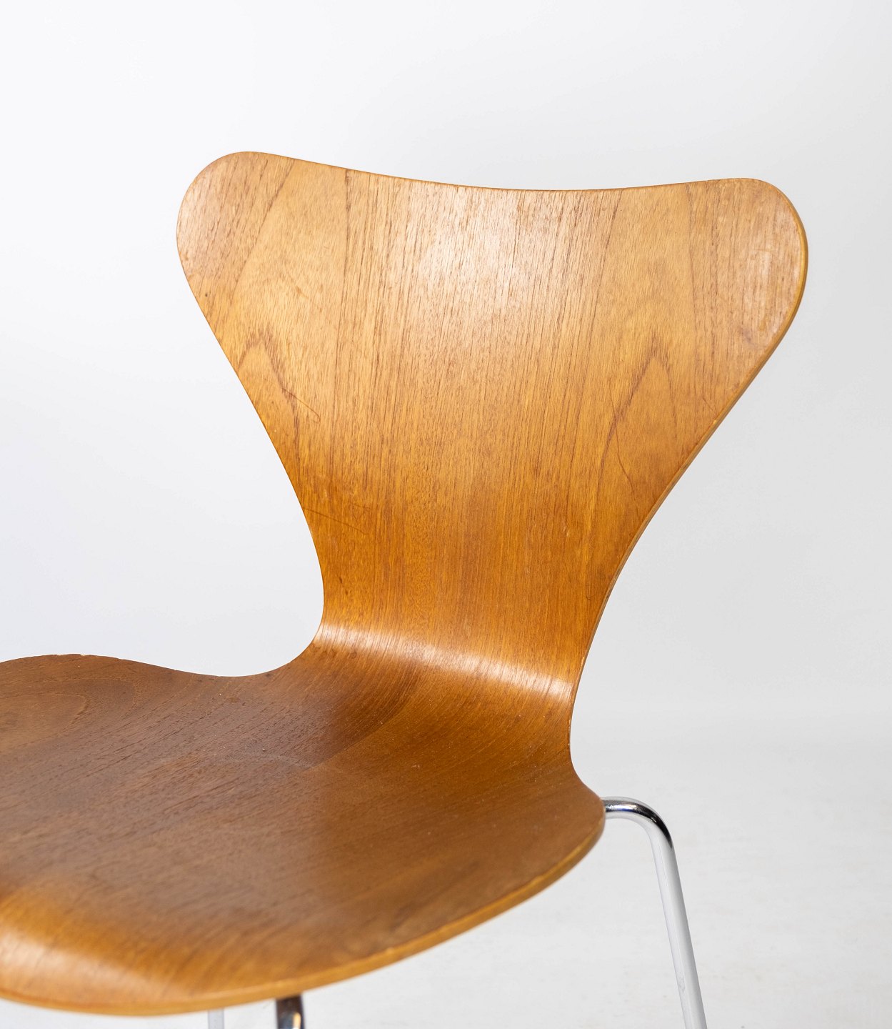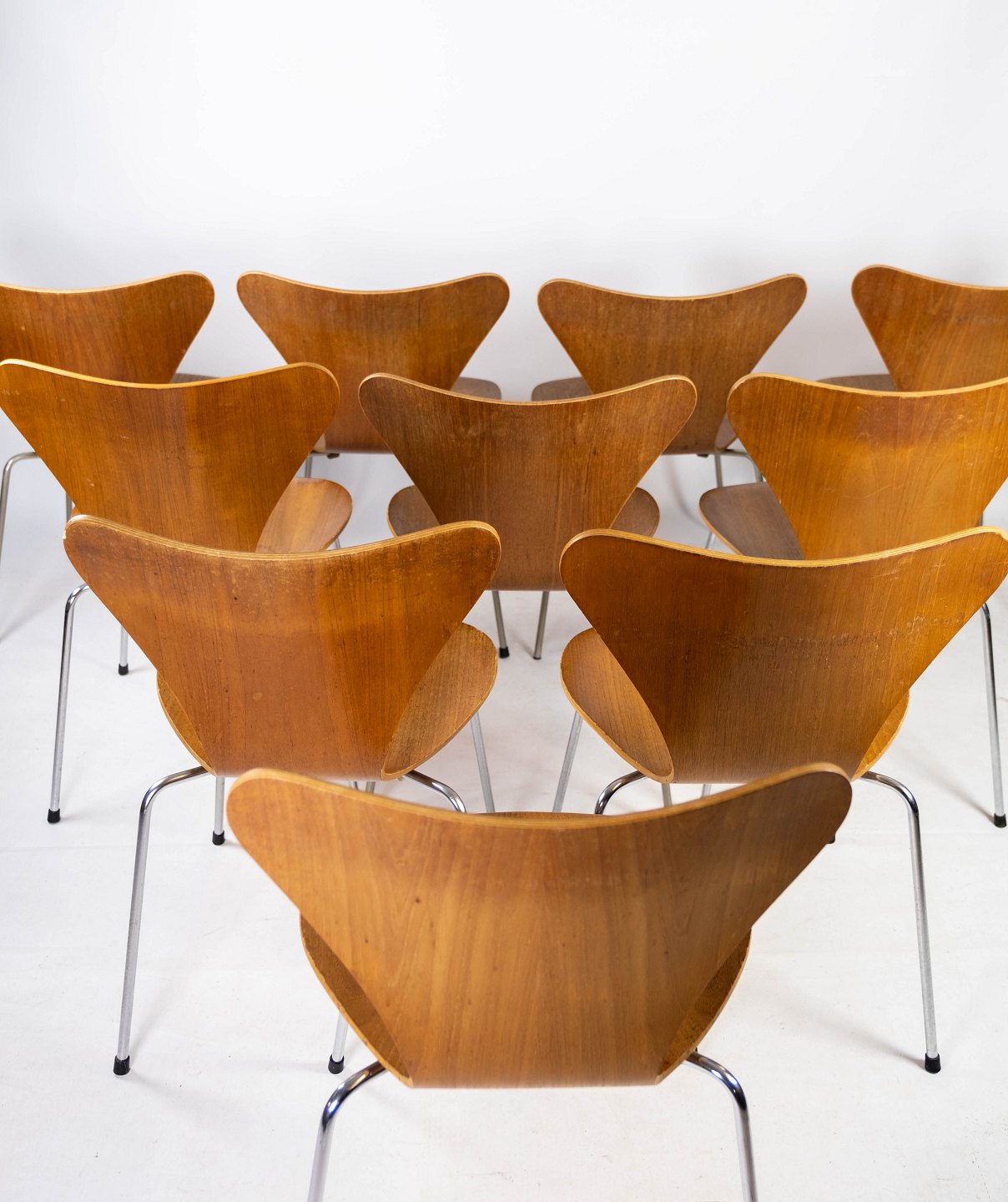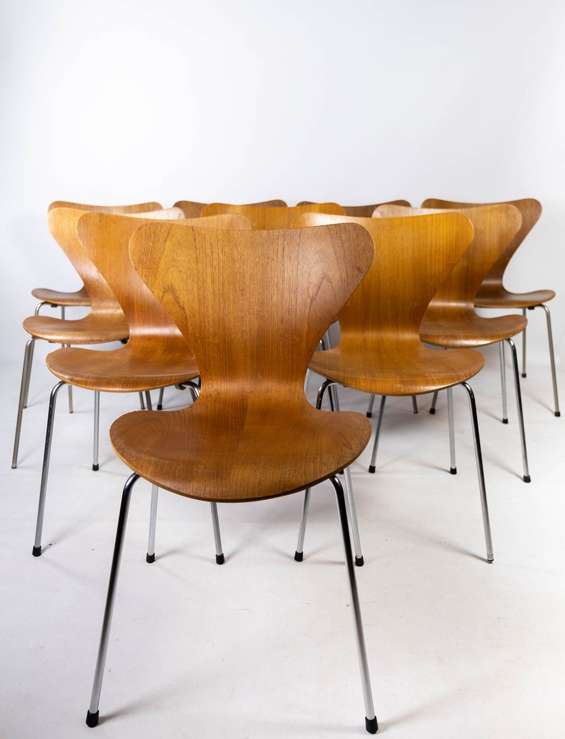 SoldA set of 12 series Seven chairs, model 3107, of teak designed by Arne Jacobsen and manufactured by Fritz Hansen in 1996. The chairs are in great vintage condition.