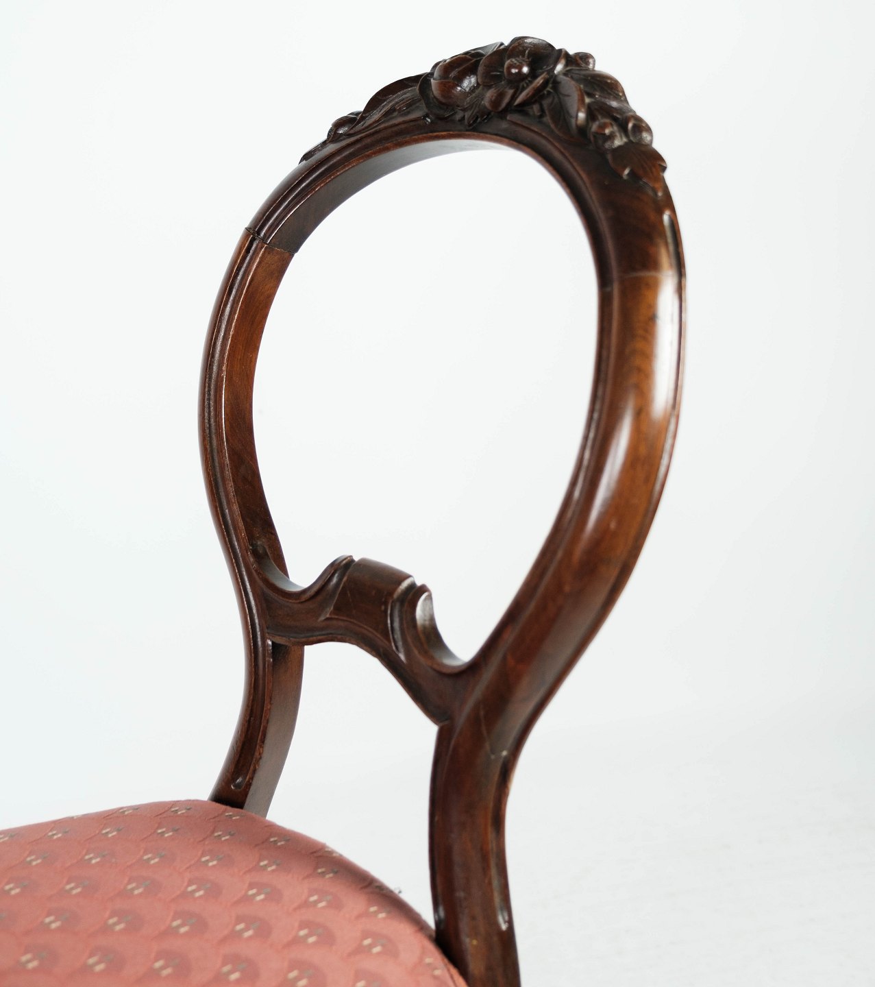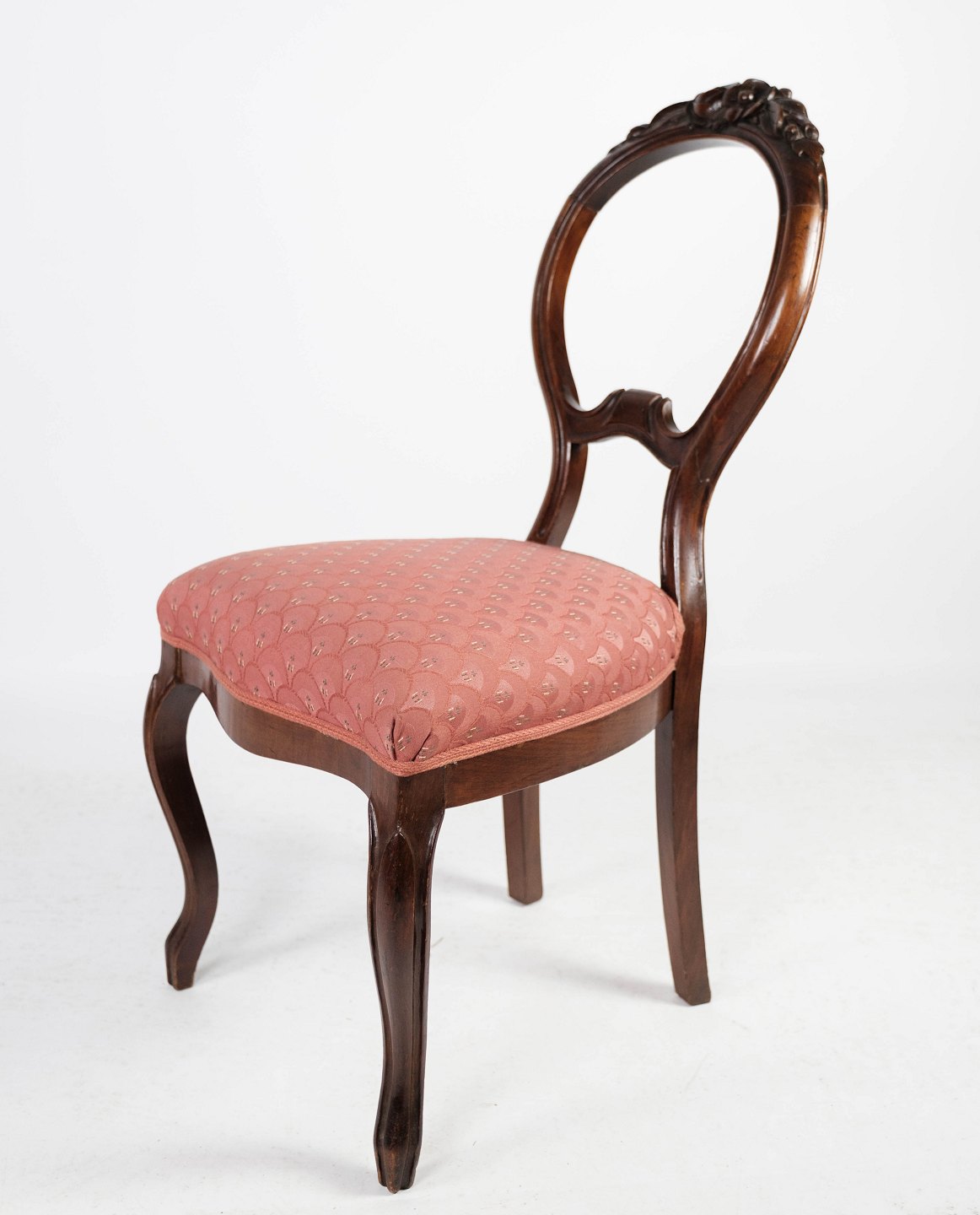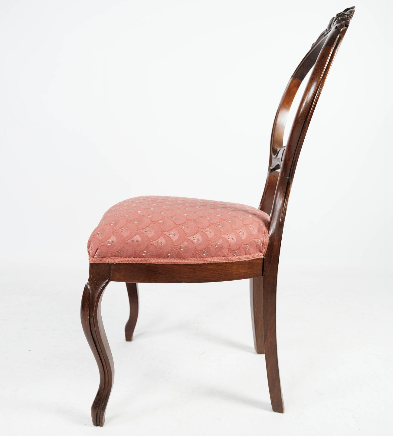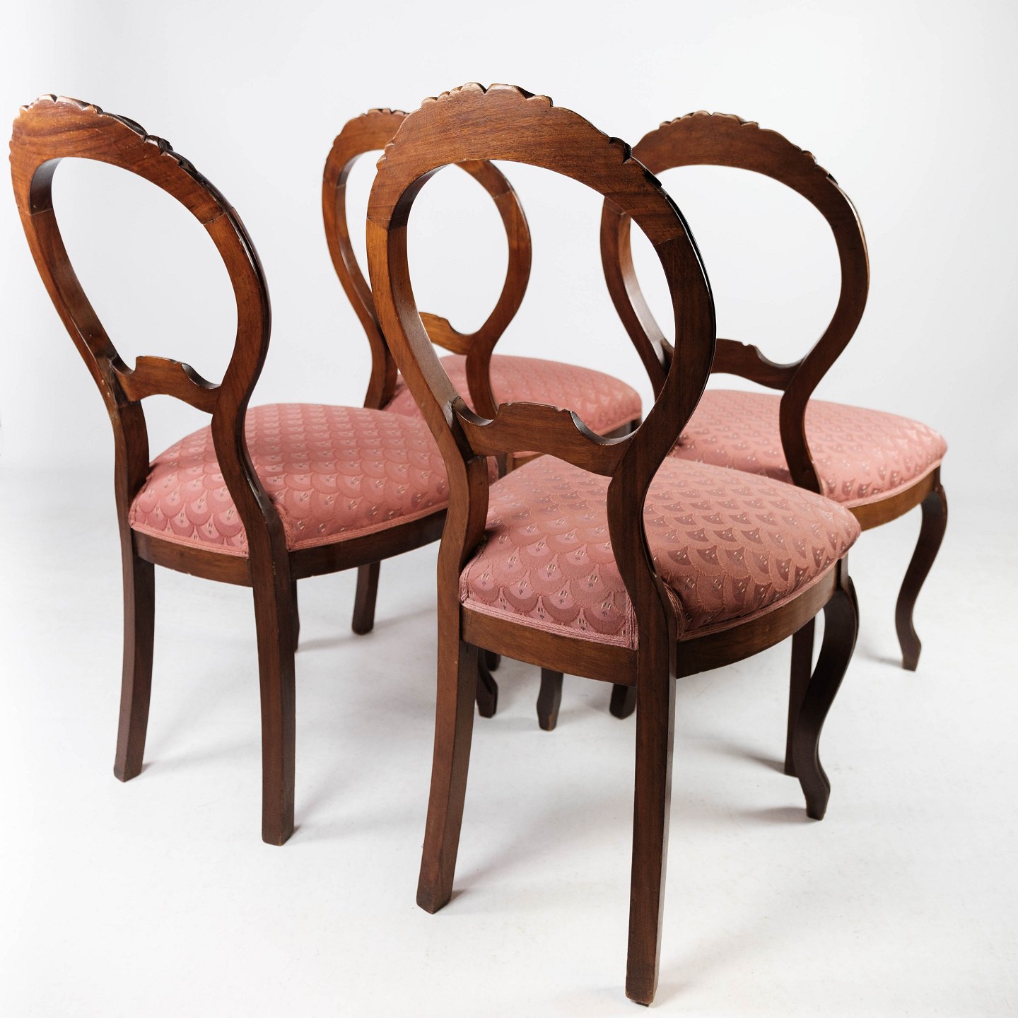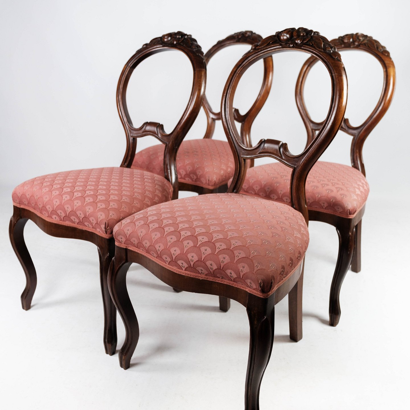 Set of four Rococo dining room chairs of mahogany and upholstered with red fabric from 1860. The chairs are in great vintage condition.