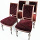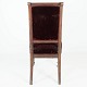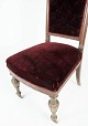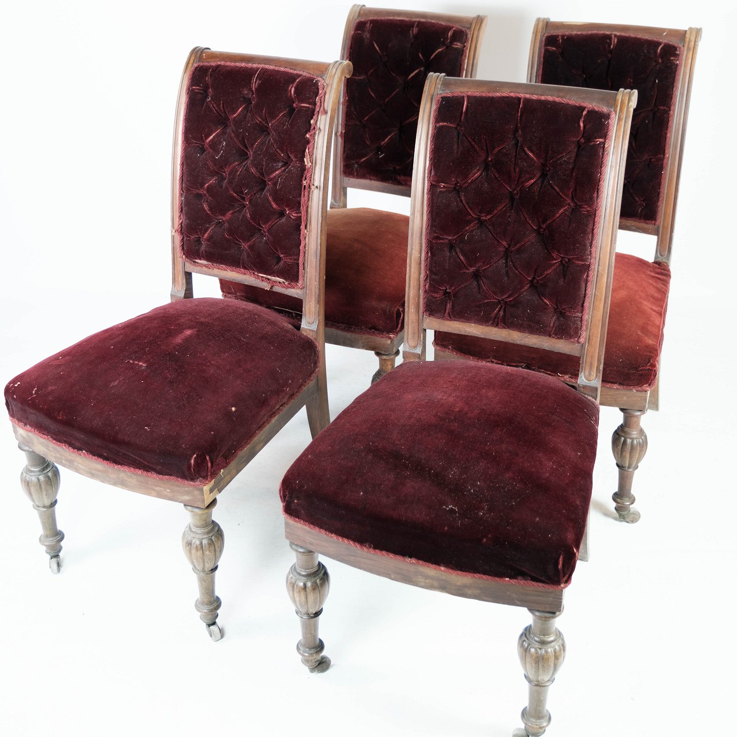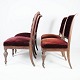 Sæt af fire spisestuestole af mahogni og polstret med bordeaux velour fra 1920erne. Stolene er urestaureret.