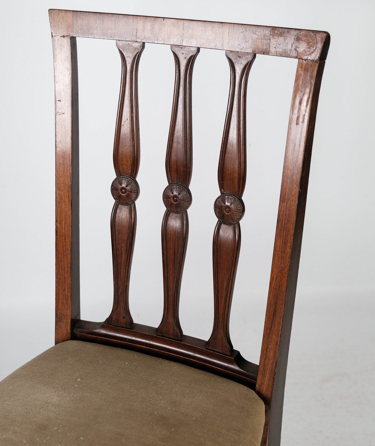 Set of four dining room chairs in rosewood and upholstered with light fabric, in great antique condition from the 1920s.