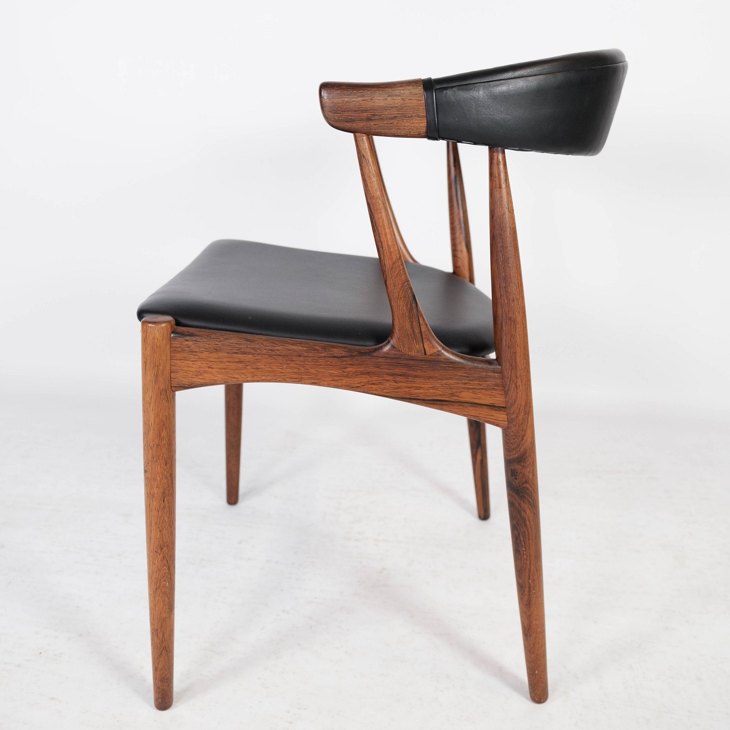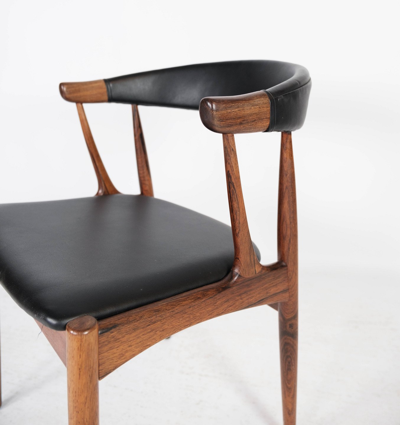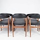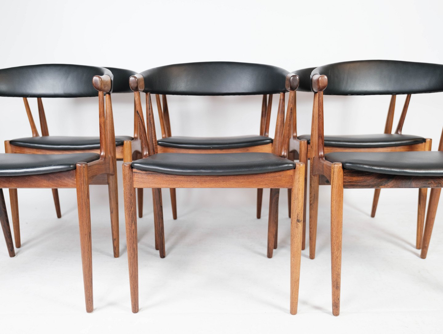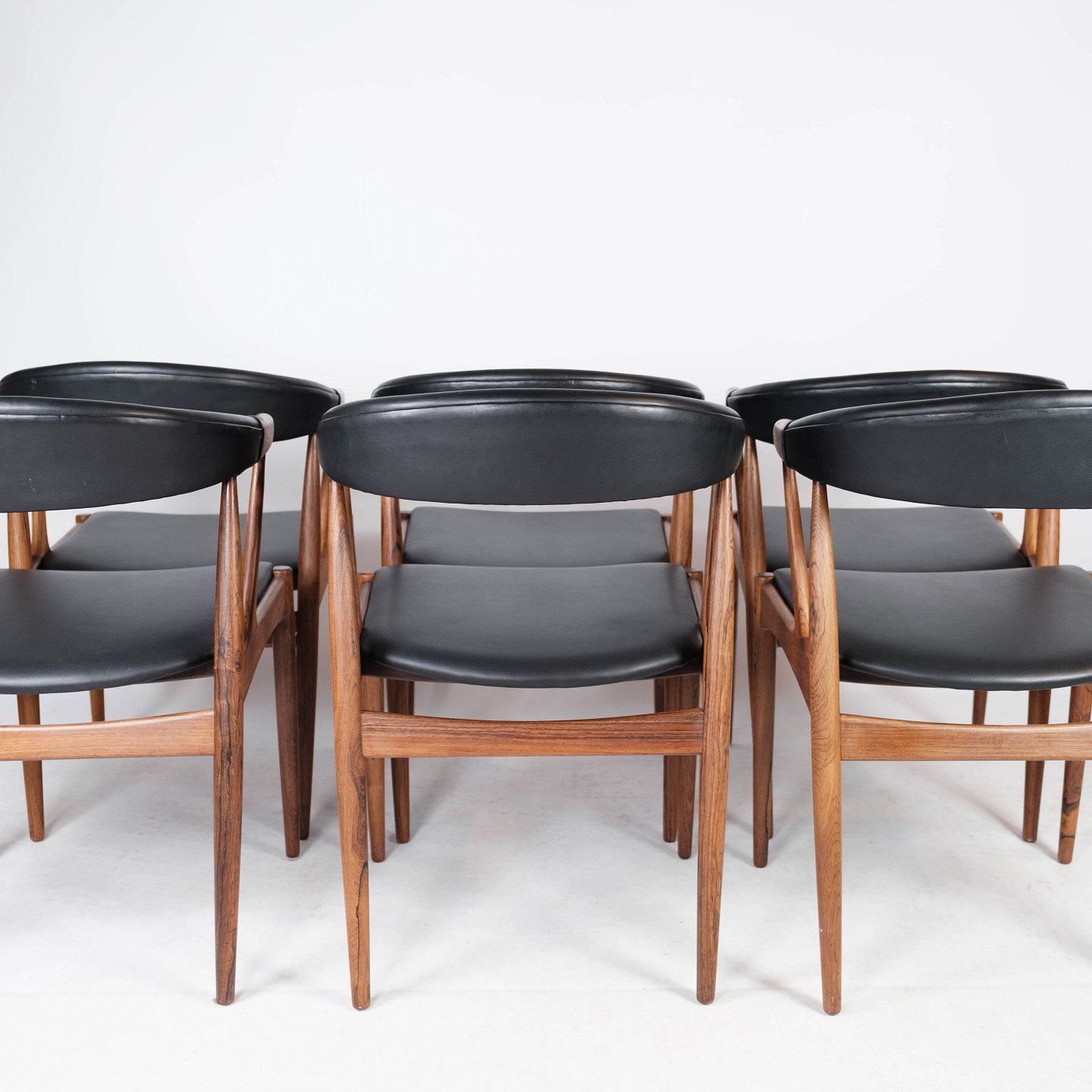 SoldSet of six dining room chairs in rosewood and newly upholstered with black elegance leather, designed by Johannes Andersen, model BA113, Manufactored by Brdr. Andersens møbelfabrik A/S. The chairs are in great vintage condition.