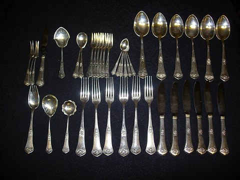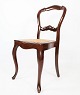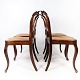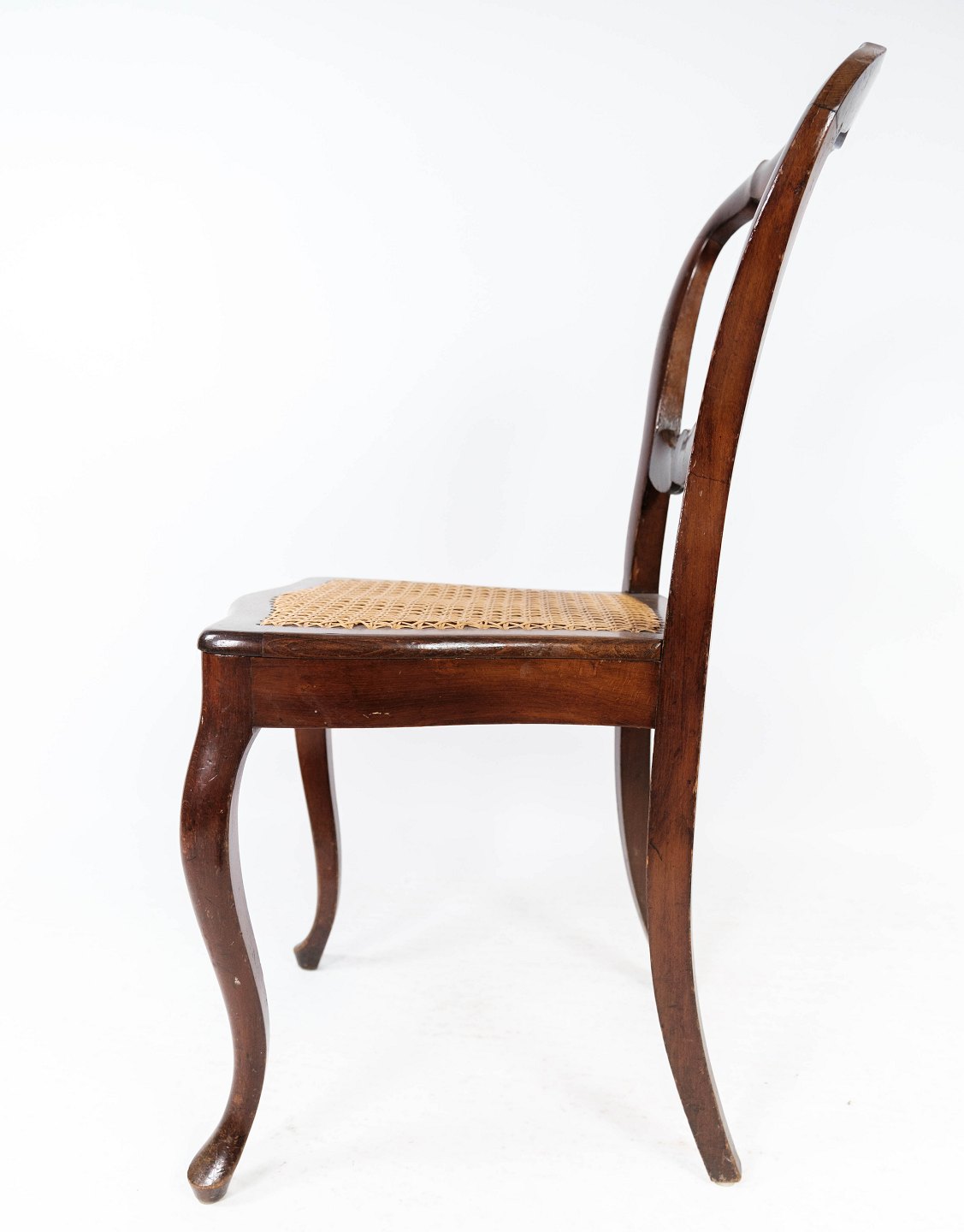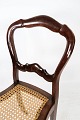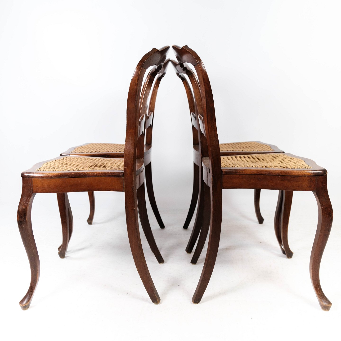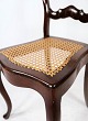 Sæt af fire rokoko spisestuestole af mahogni og med sæde af fransk rørflet fra 1860. Stolene er i flot antik stand.