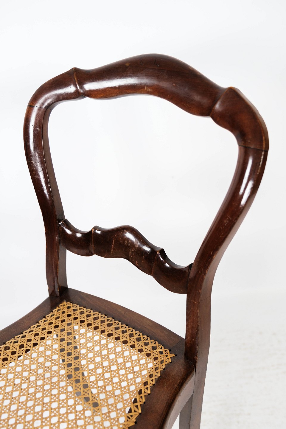 Sæt af fire rokoko spisestuestole af mahogni og med sæde af fransk rørflet fra 1860.
