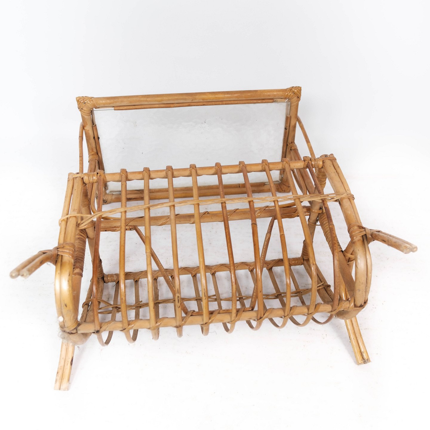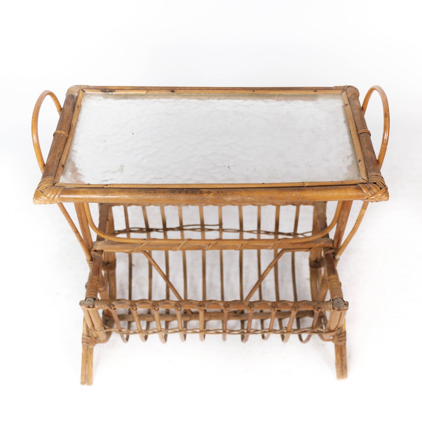 Sidebord af lyst træ med glasplade og opbevaring under, i flot brugt stand.