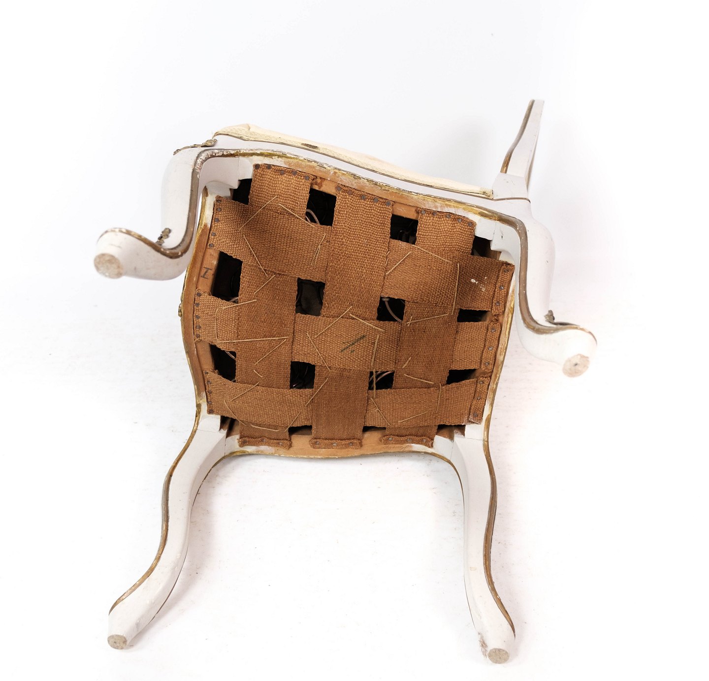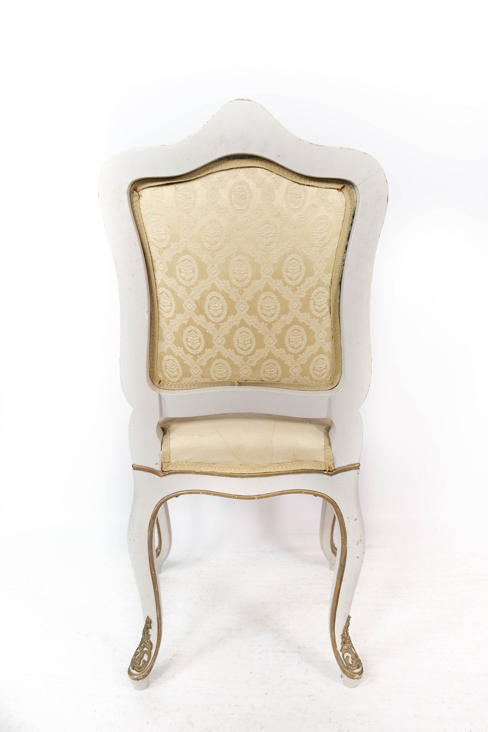 Spisestuestol af hvid malet træ og polstret med lyst stof, i flot antik stand fra omkring 1880.