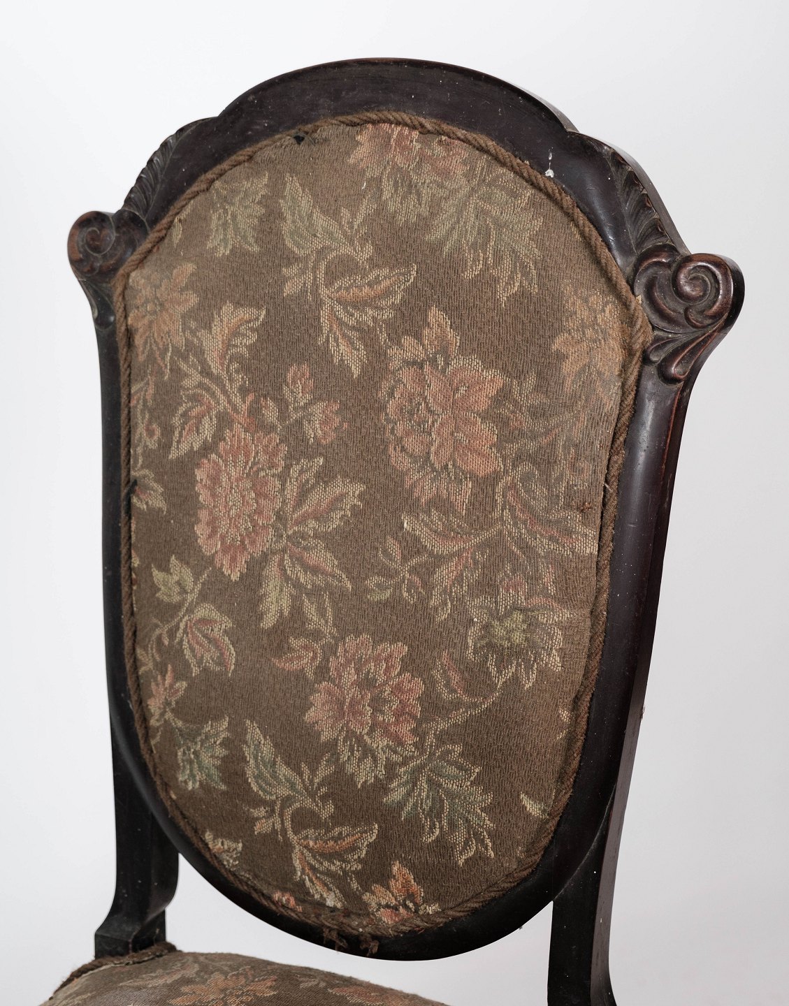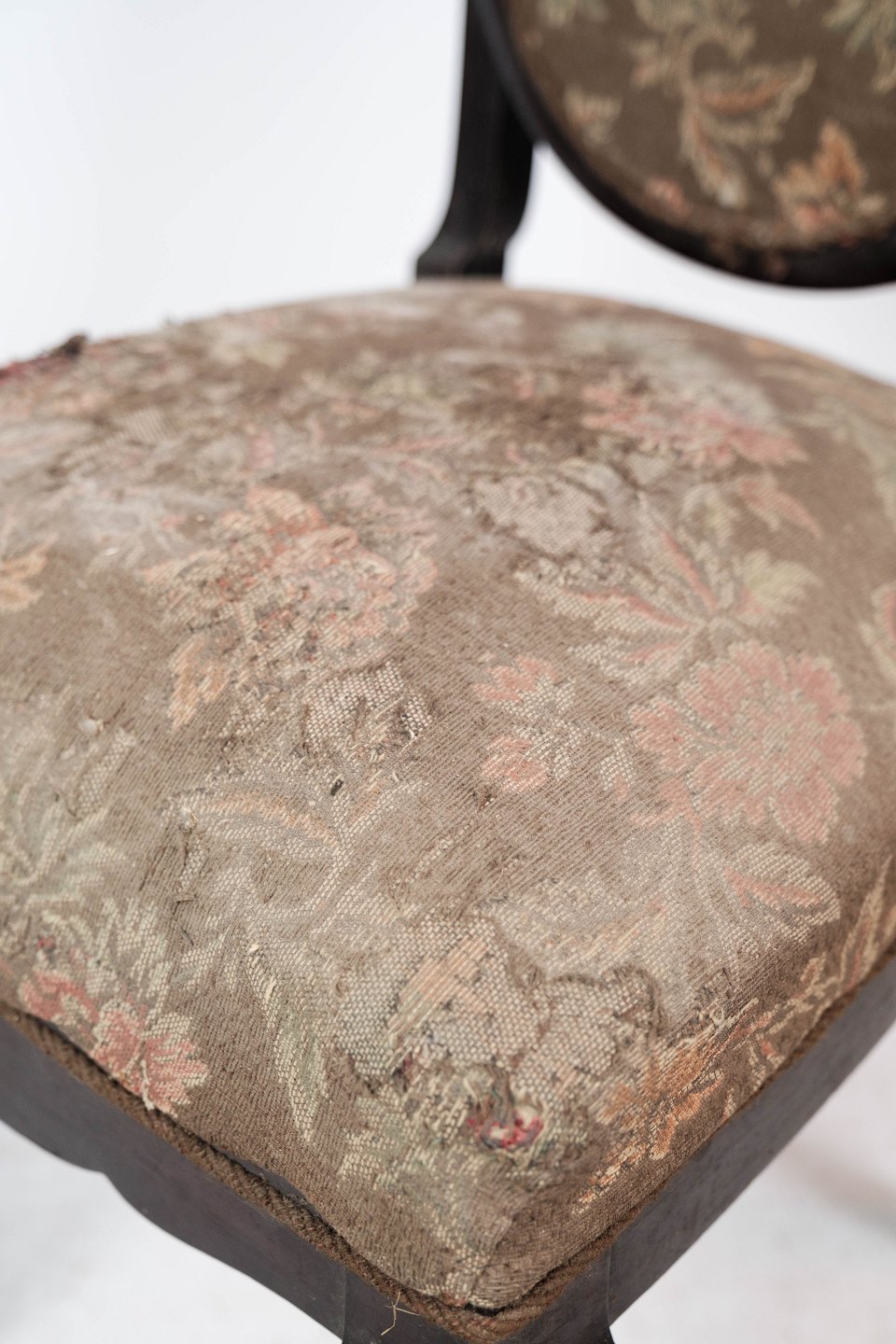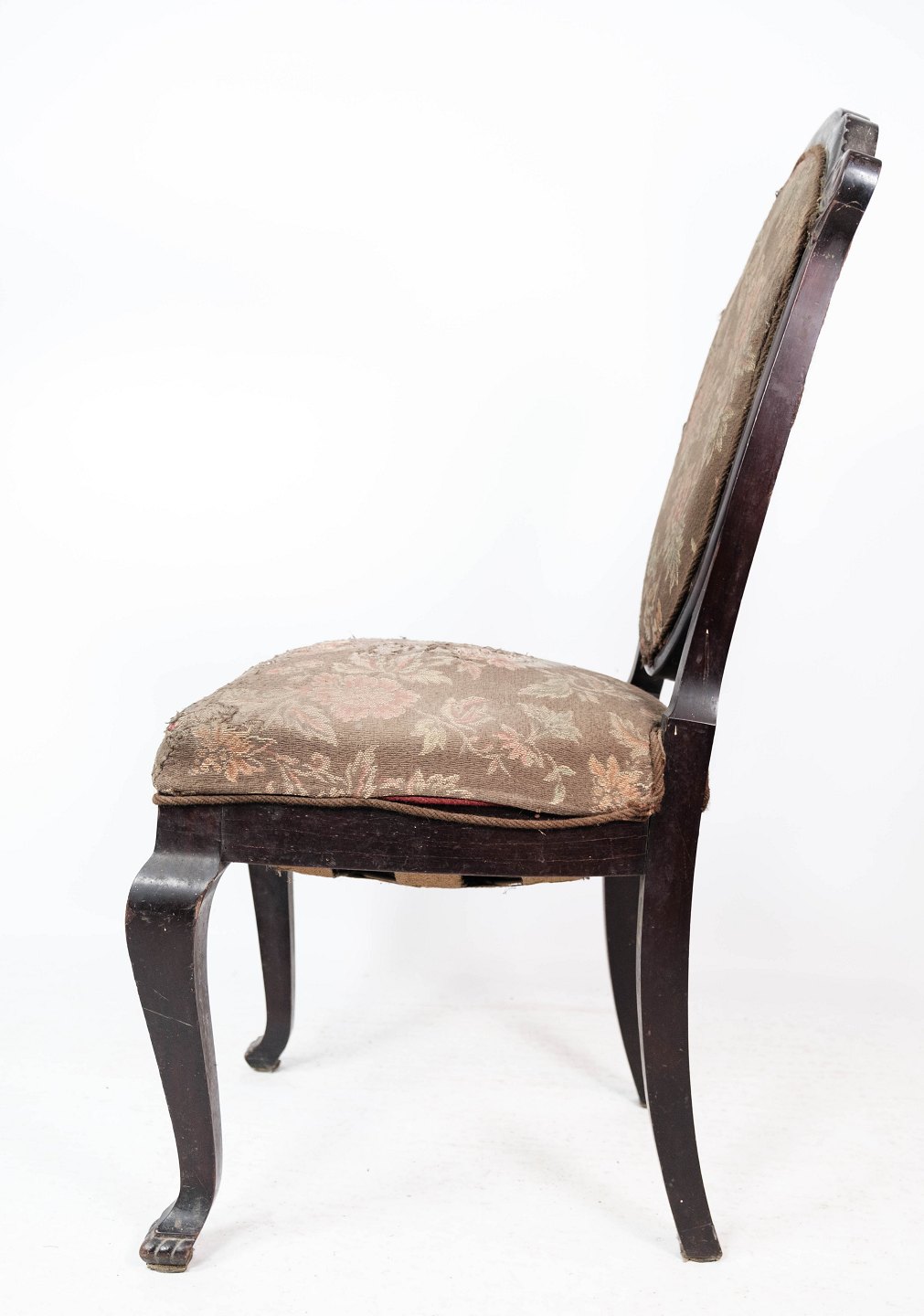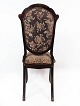 Spisestuestol af mahogni og polstret med blomstret stof, i flot antik stand.