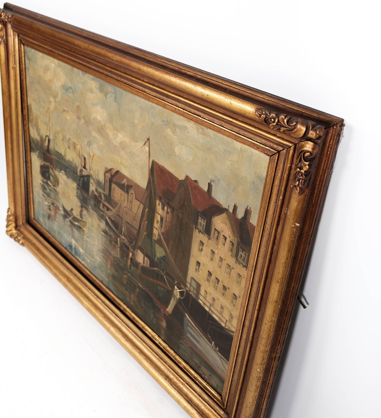 Oil painting with motif of Copenhagen and gilded frame, signed by Valdemar Brunø.