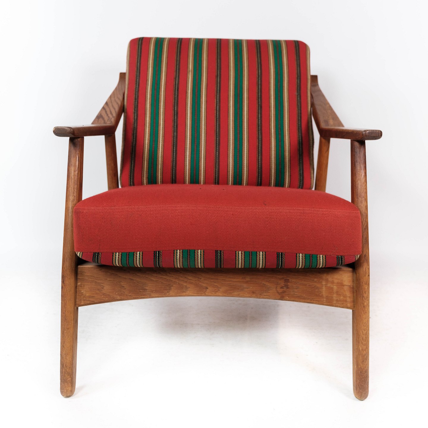 Armstol i eg og polstret med rødt stof, designet af H. Brockmann Pedersen fra 1960erne.Stolen er i flot brugt stand.