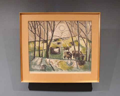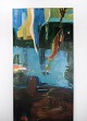 Højt oliemaleri på lærred i mørke farver af den dansk kunster Åse Højer, f. 1952.