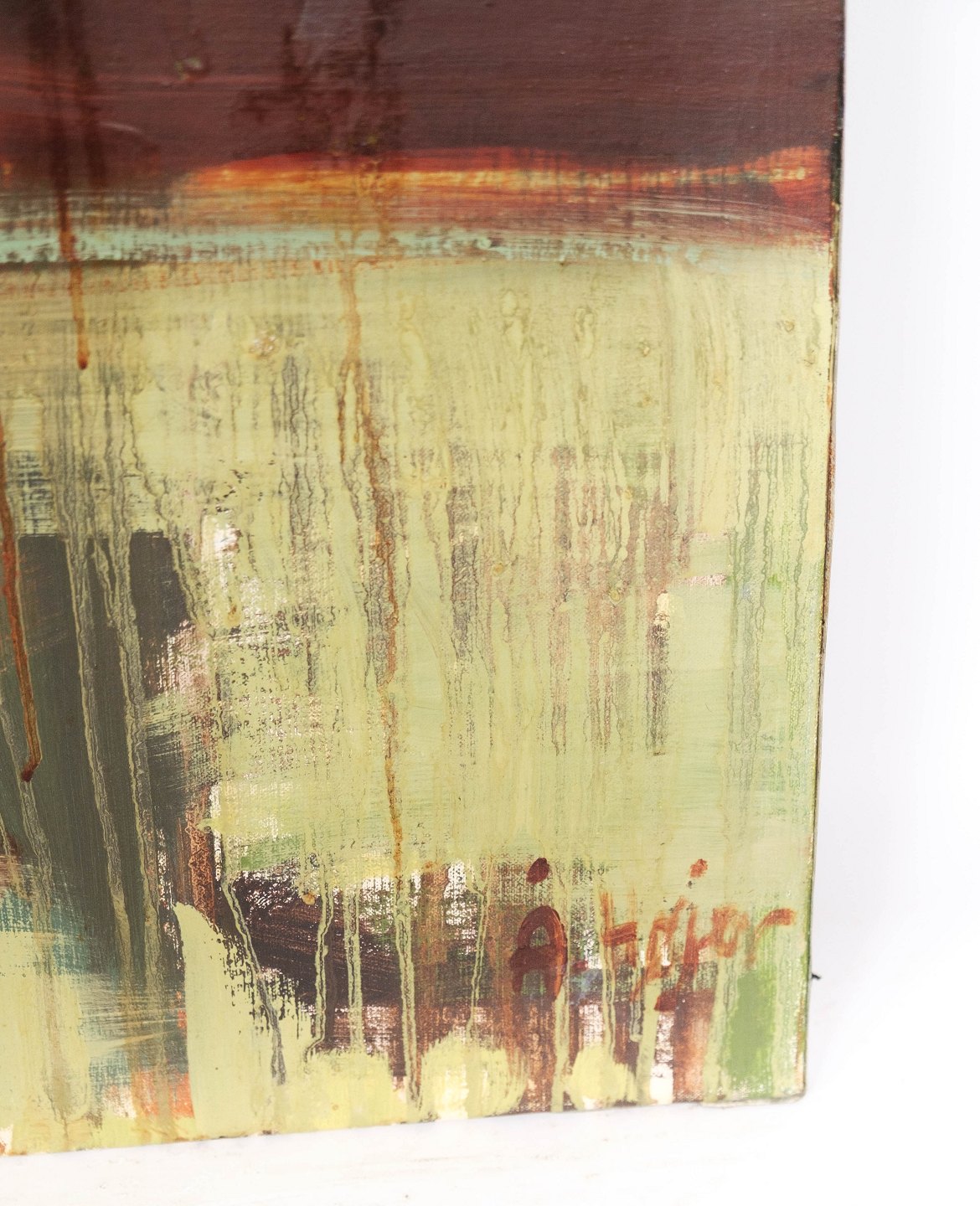 Tall oil painting on canvas in dark colors by the danish artist Åse Højer, b. 1952.