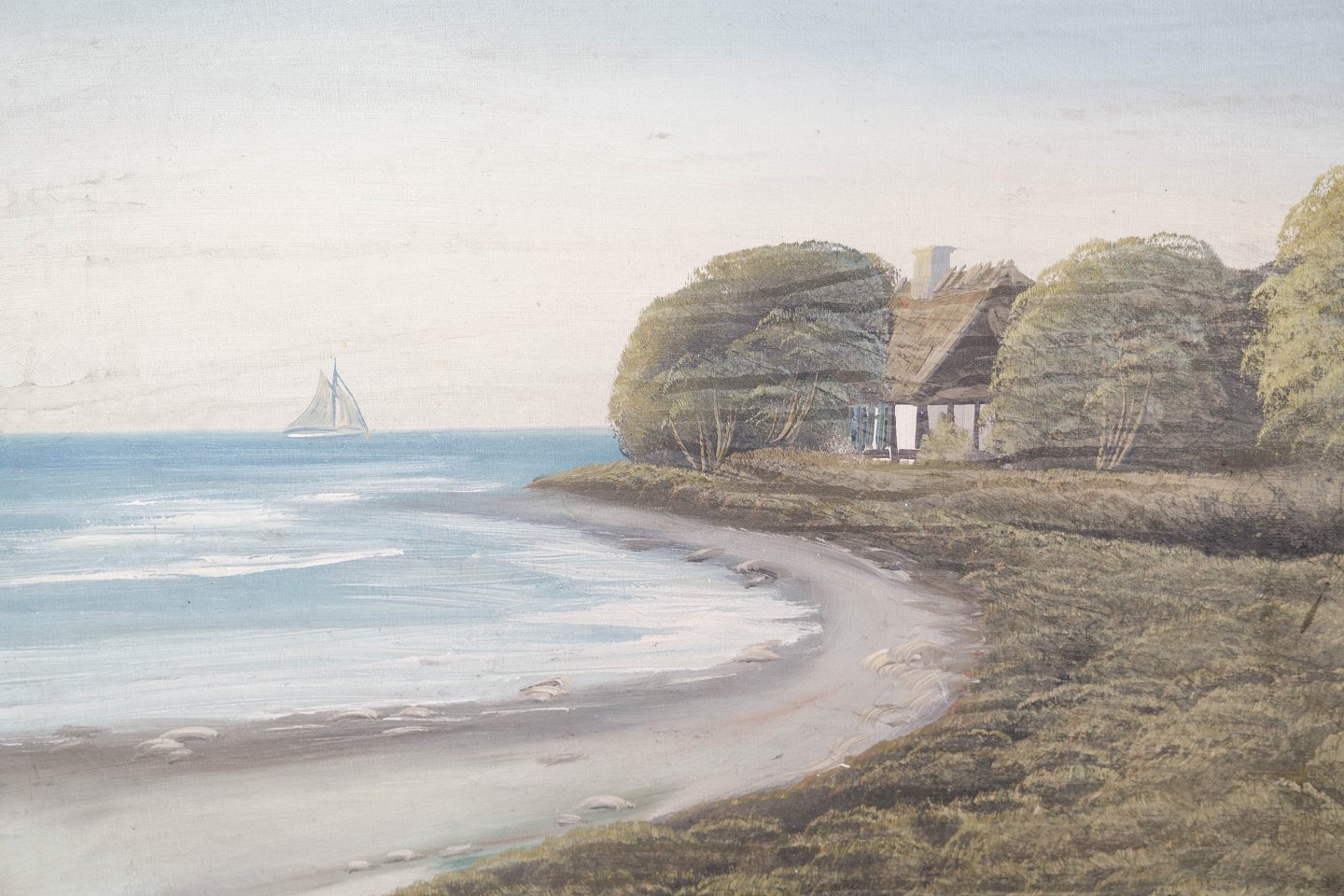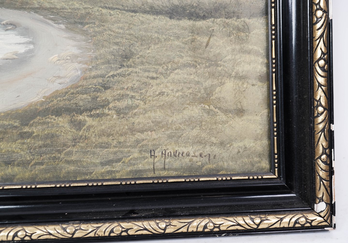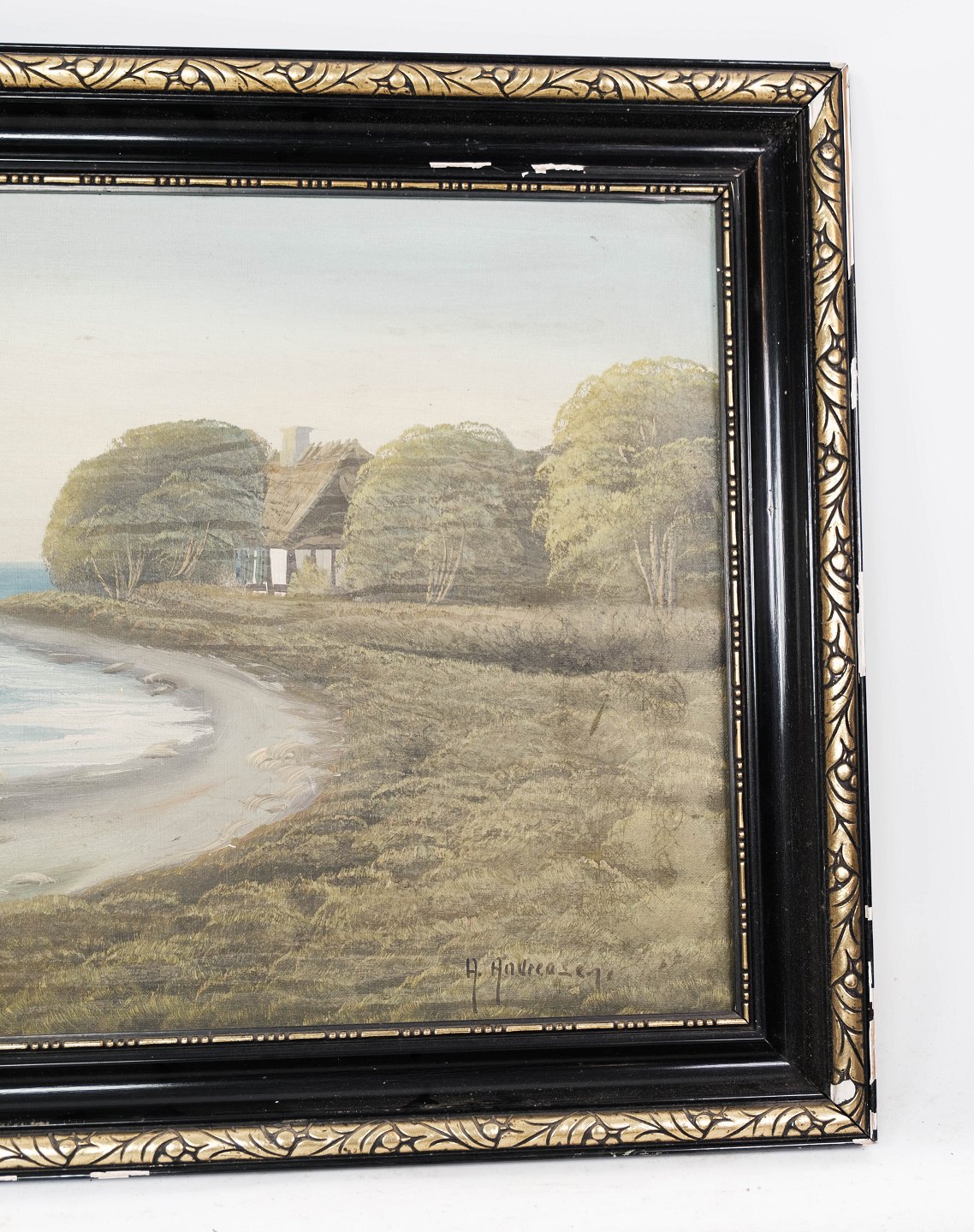 Maleri på lærred med strand motiv og sort ramme, med ukendt signatur.