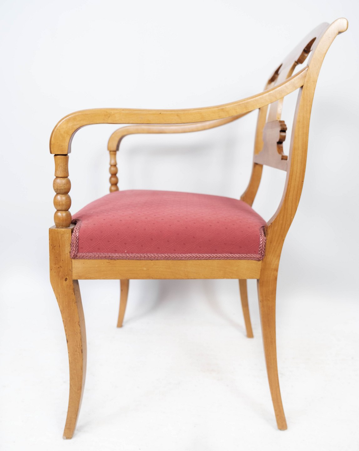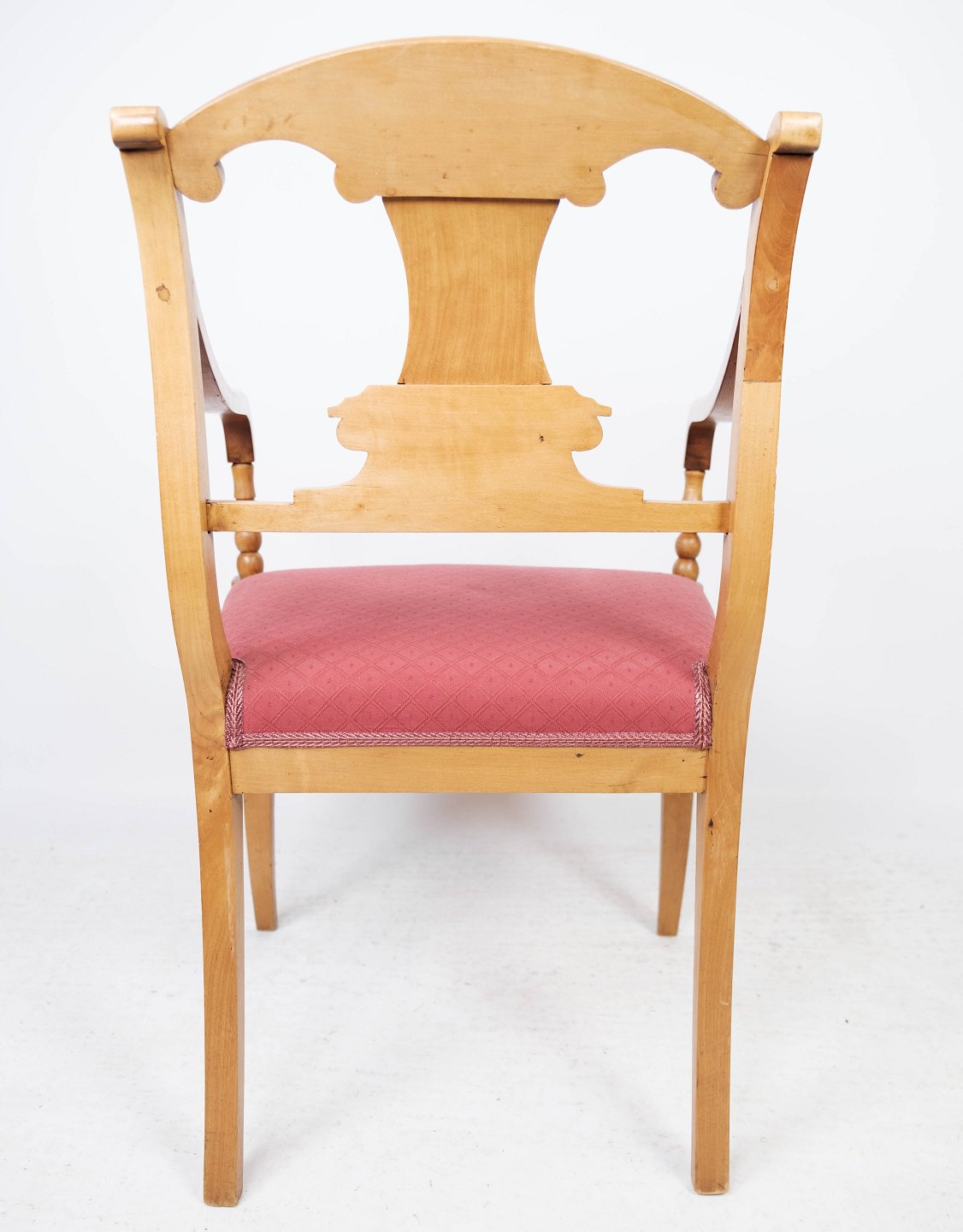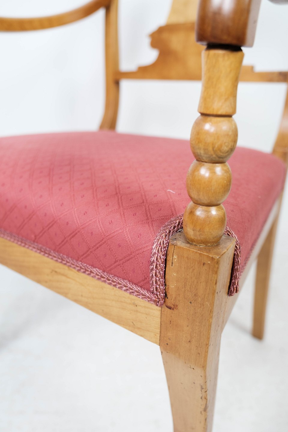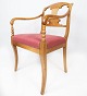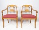 Et par sen Empire armstole af birketræ og polstret med velour, fra omkring 1840erne. Stolene er i flot antik stand.