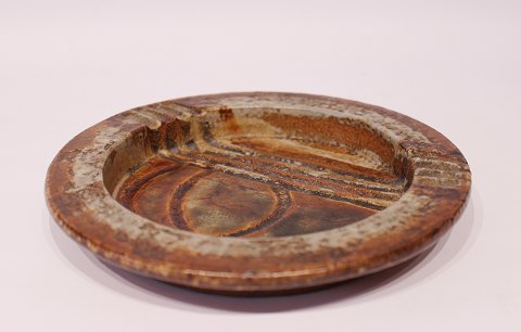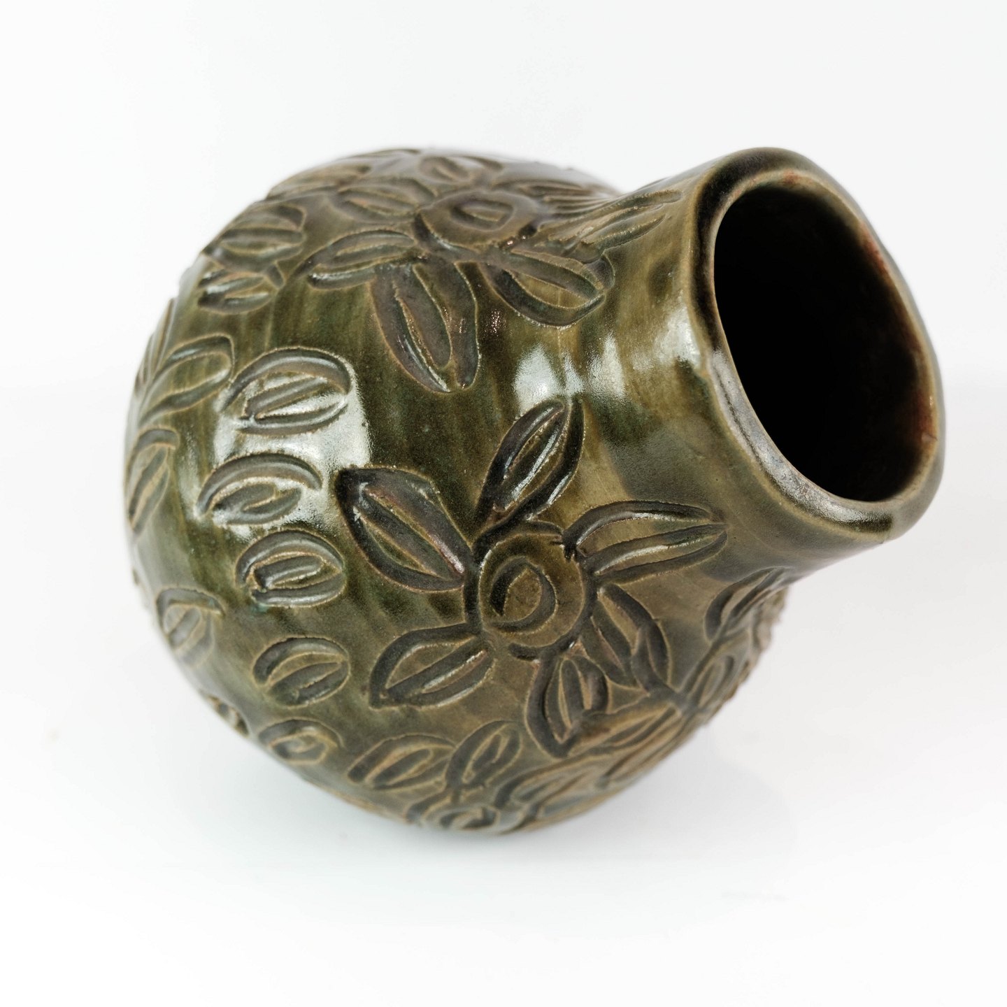 Keramikvasen med mørk glasur og et blomstret mønster repræsenterer det tidløse og karakteristiske design af dansk keramik fra 1960'erne.