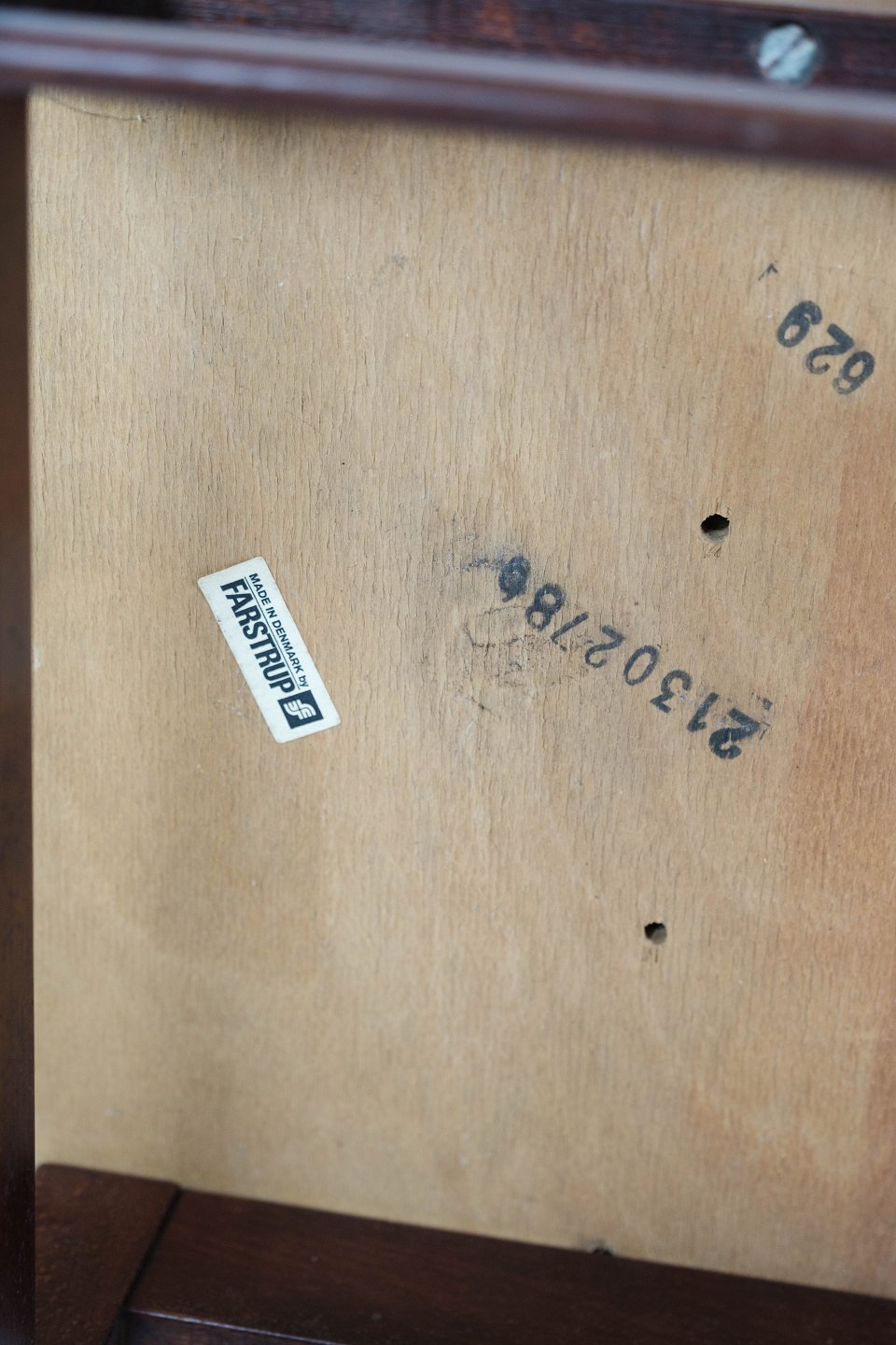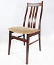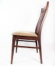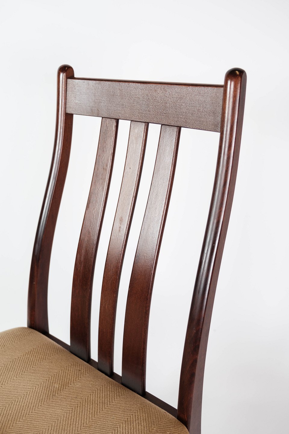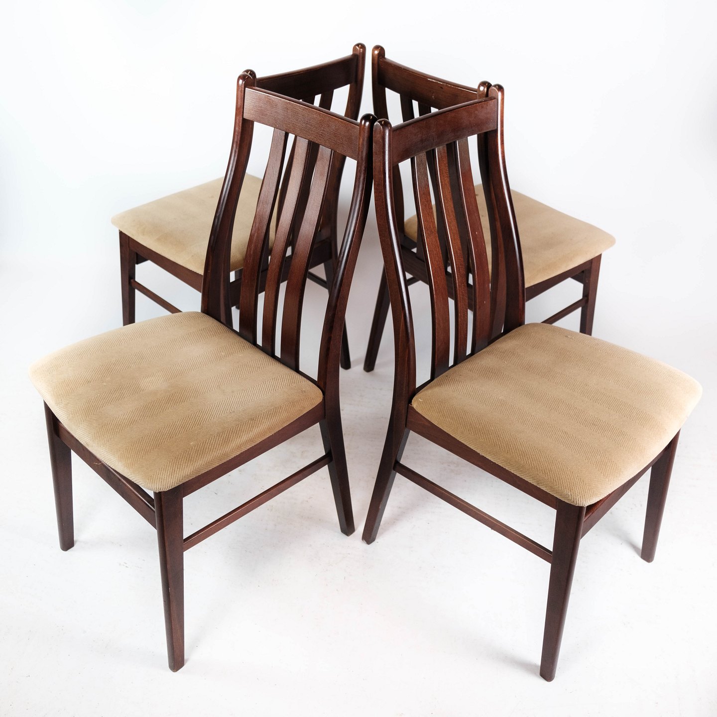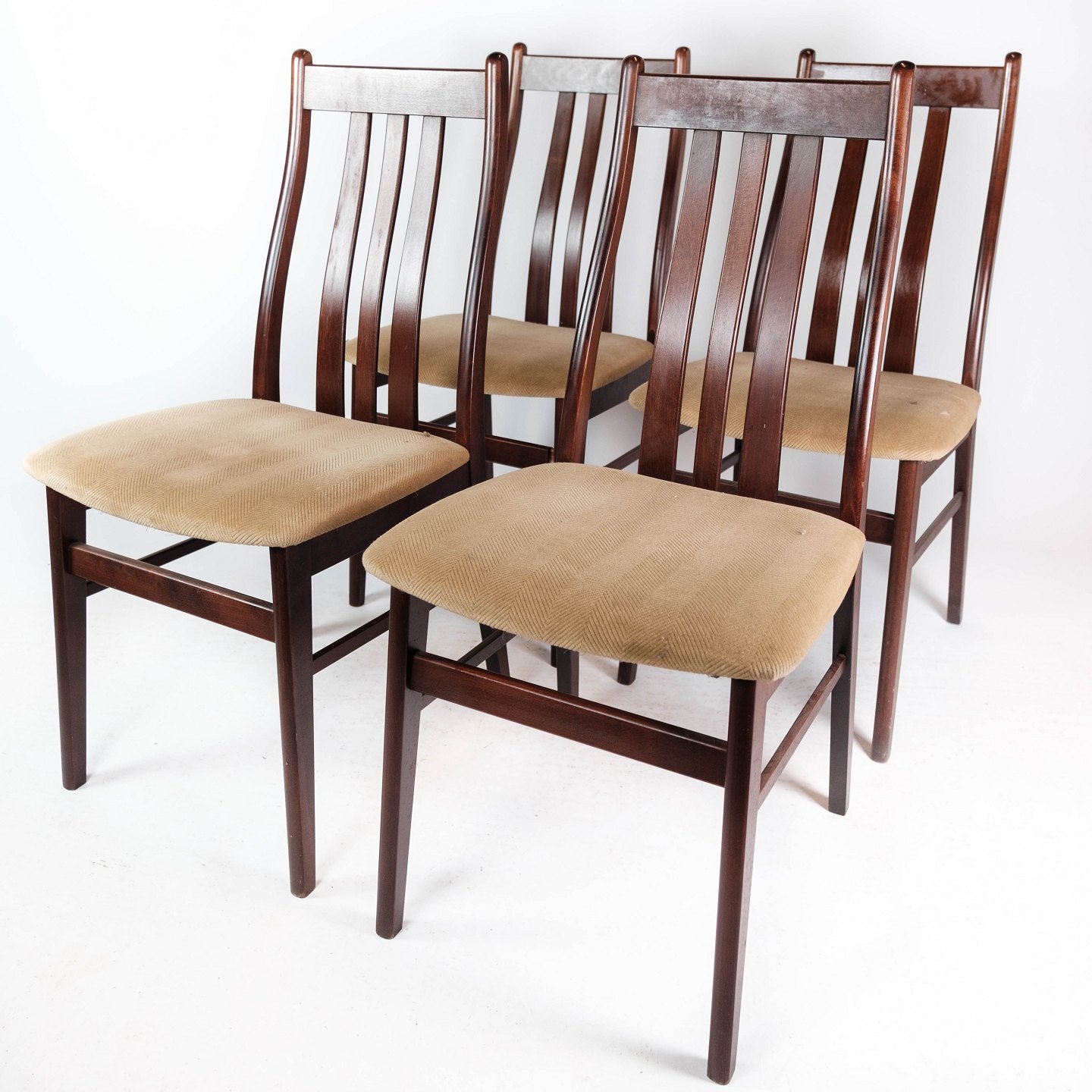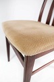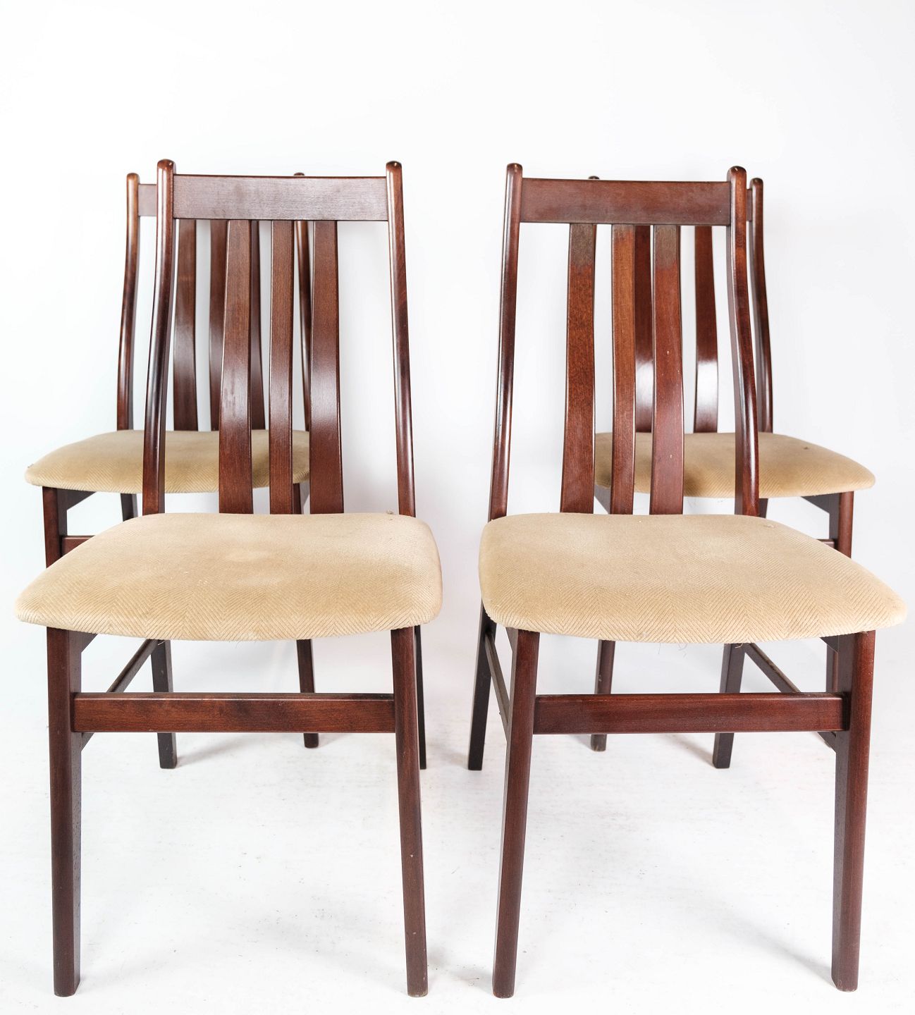 Set of four dining room chairs of mahogany and upholstered with light fabric, of Danish design manufactured by Farstrup Furniture in the 1960s. The chairs are in great vintage condition.