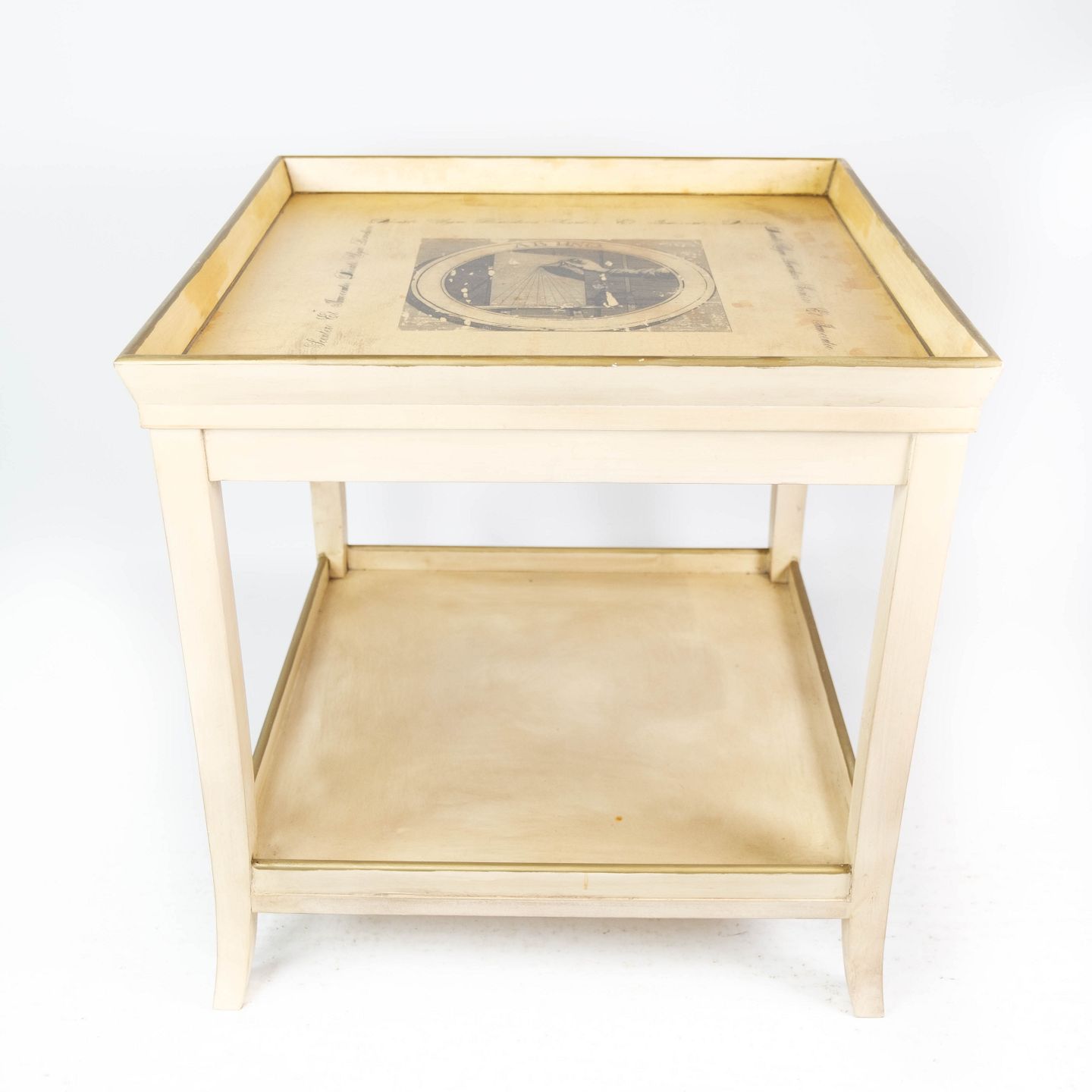 Antikt sidebord af hvid malet træ og dekoreret med tryk.