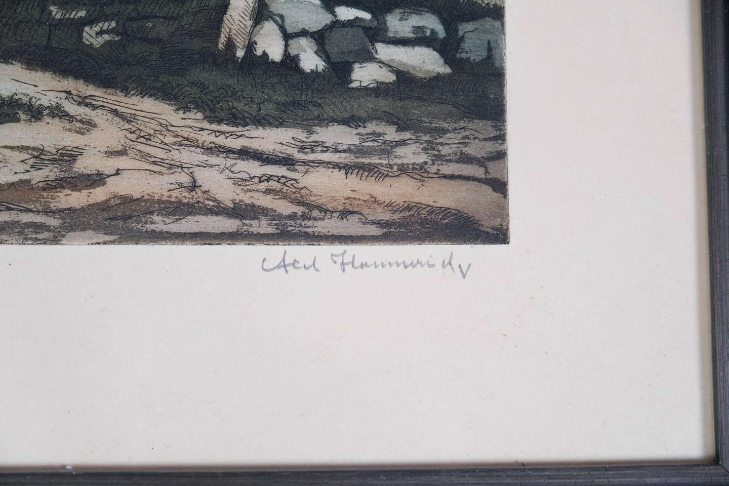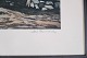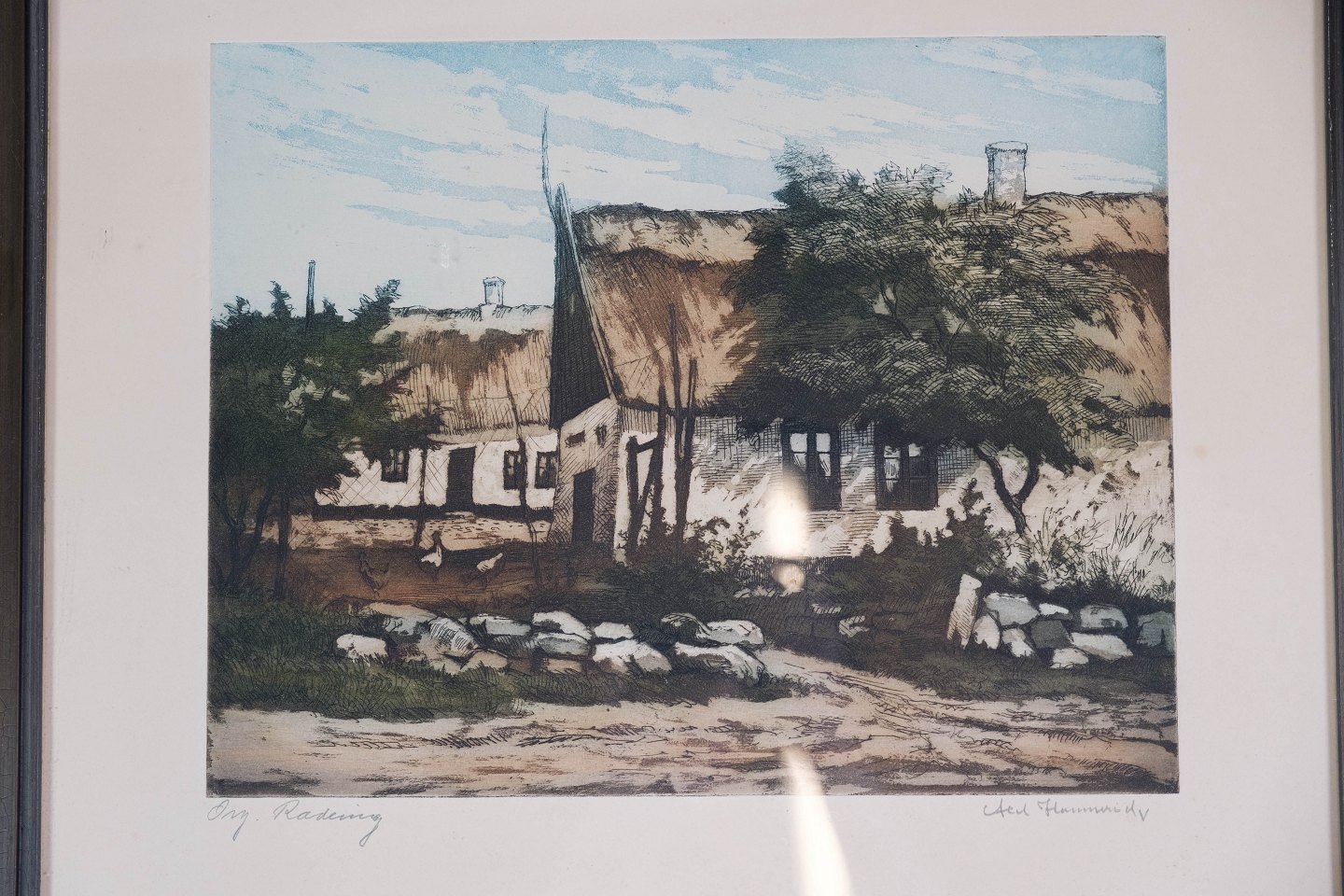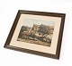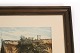 Tegning af stråtækt hus med ukendt signatur og mørk træramme fra 1930erne.