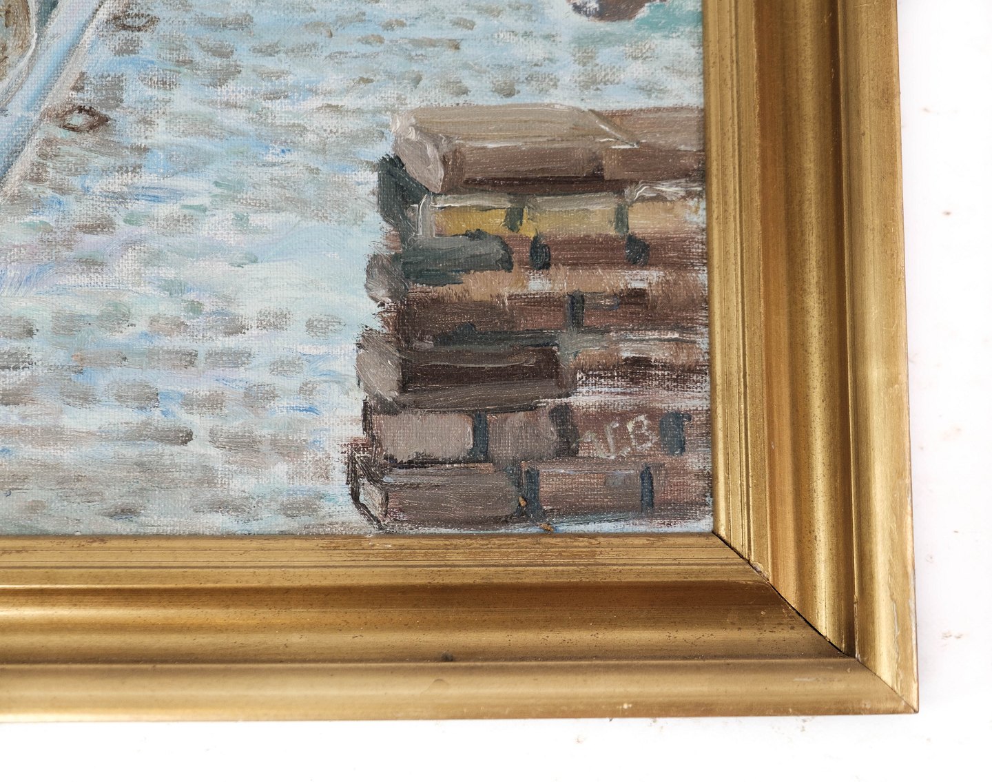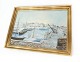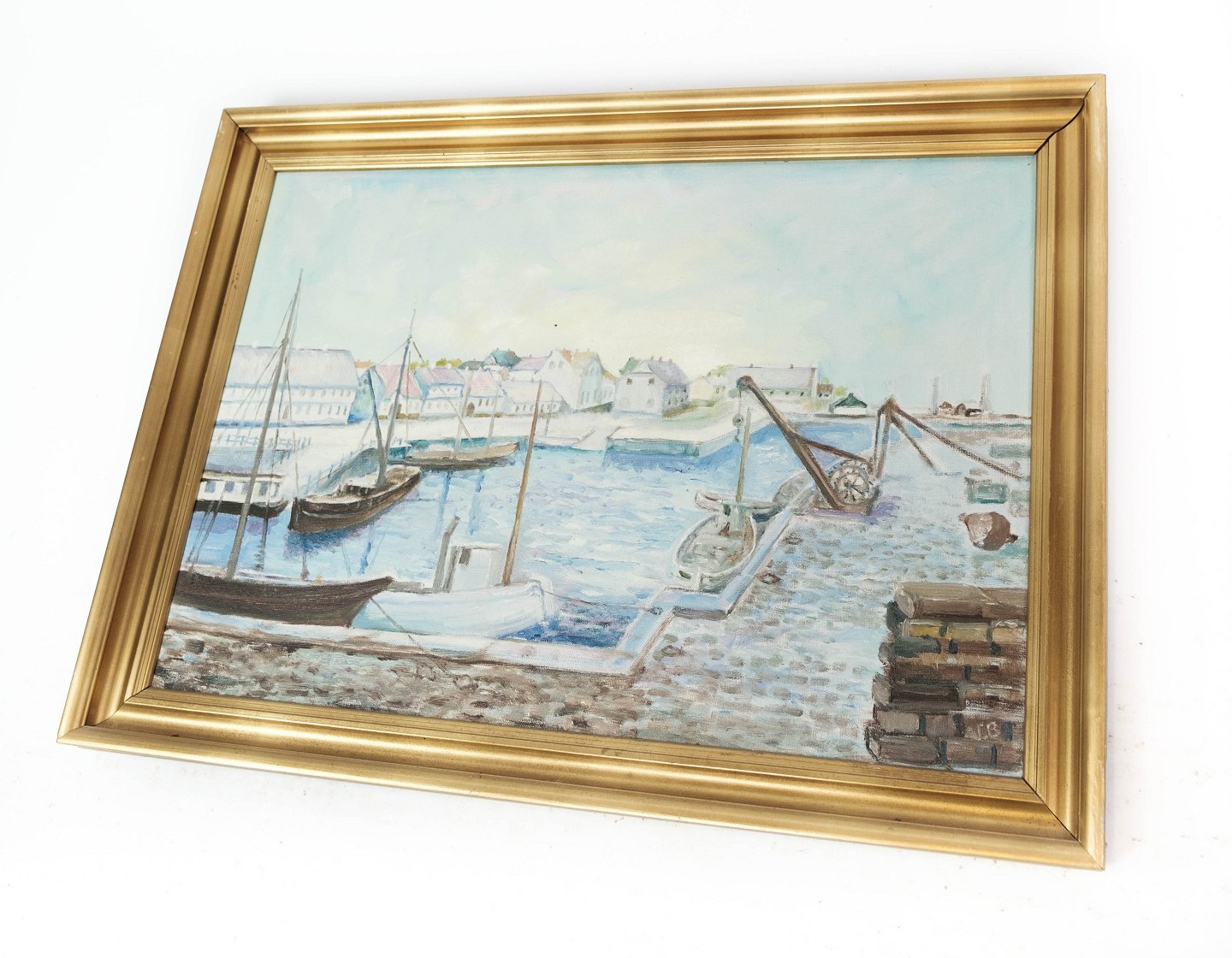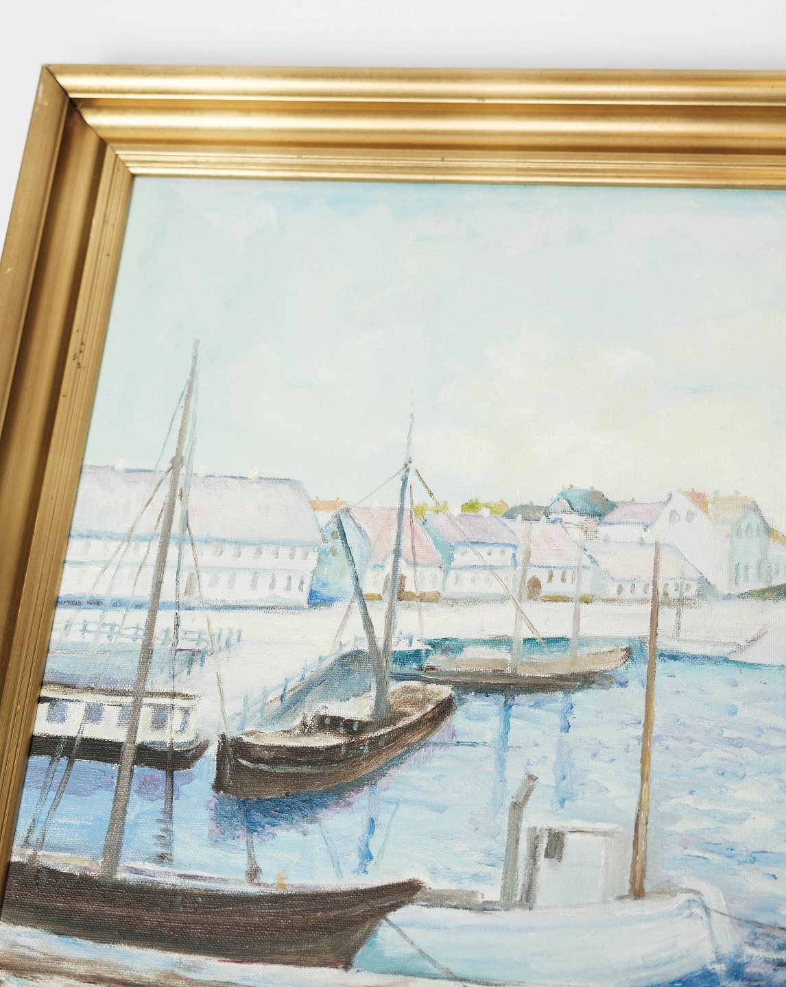 Painting on canvas with harbour motif and gilded frame, signed V.B. from the 1940s.