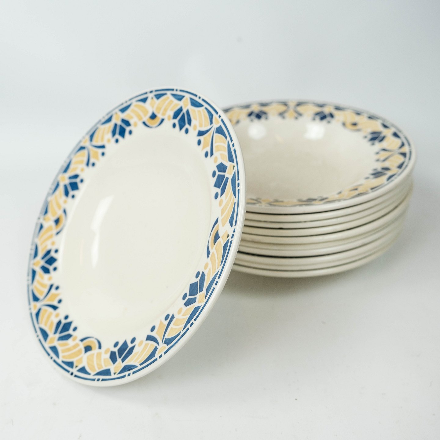Deep dinner plate decorated with blue and yellow colours from the 1960s. We have 11 in stock.