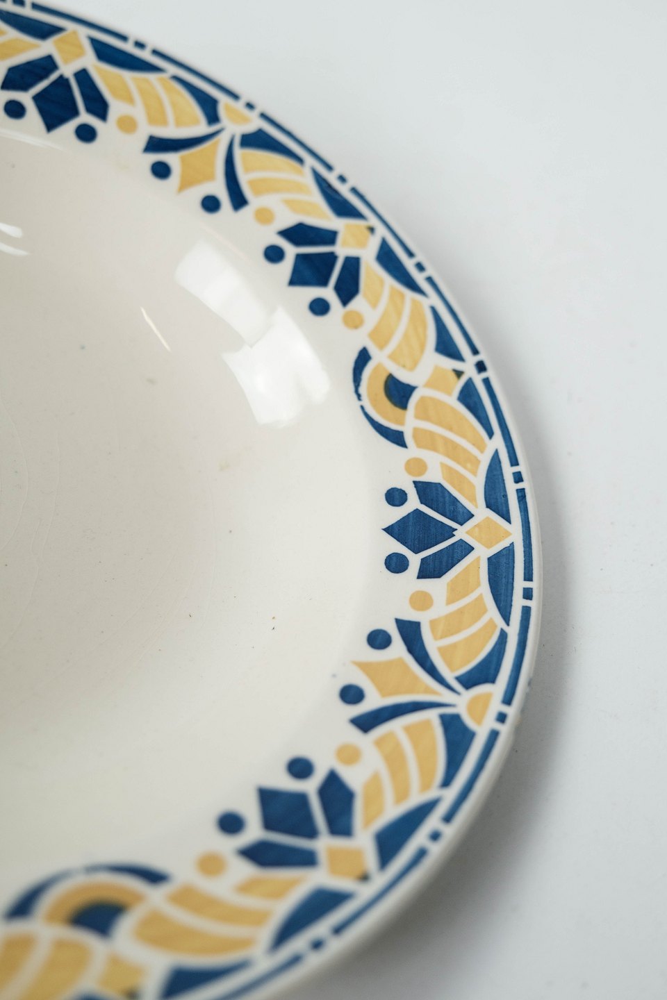 Deep dinner plate decorated with blue and yellow colours from the 1960s.