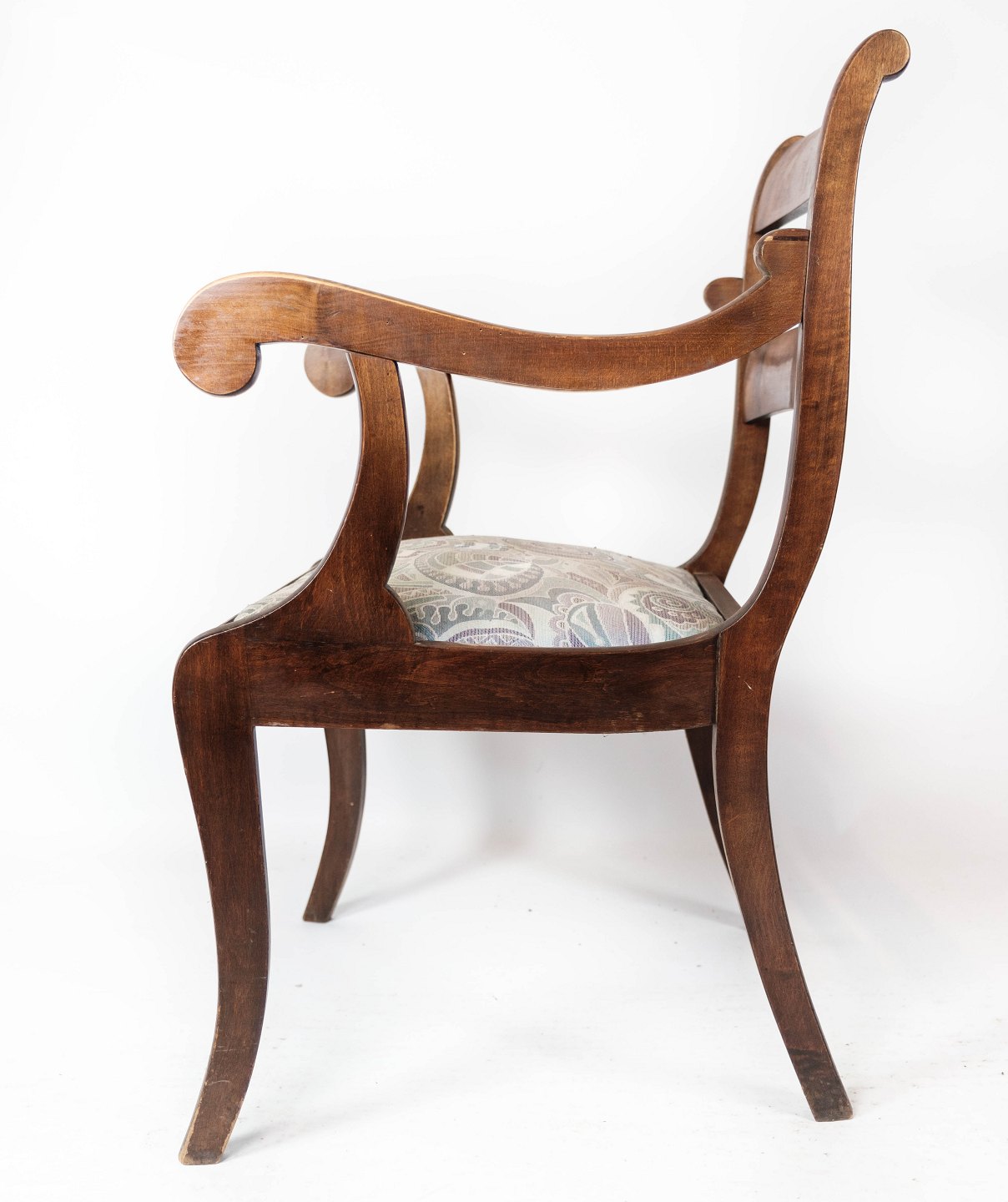 Empire antique armchair of mahogany and upholstered with light fabric from the 1840s.