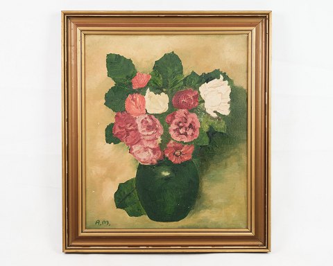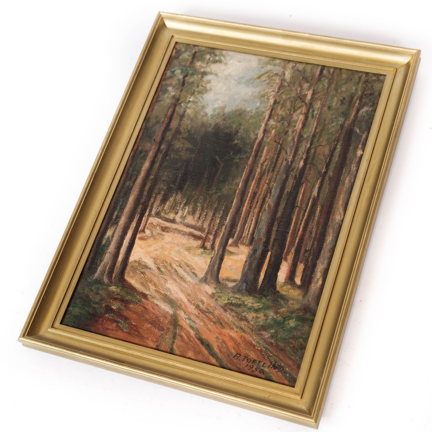 Maleri på lærred med skovmotiv og forgyldt ramme, signeret A. Toftlind 1950.