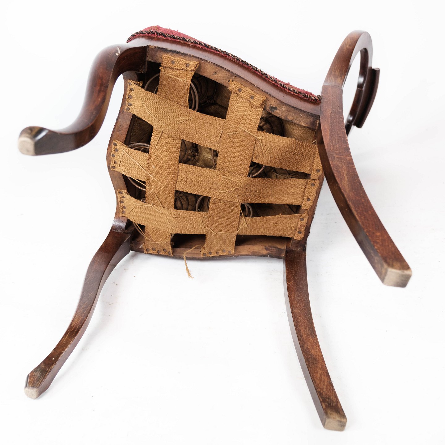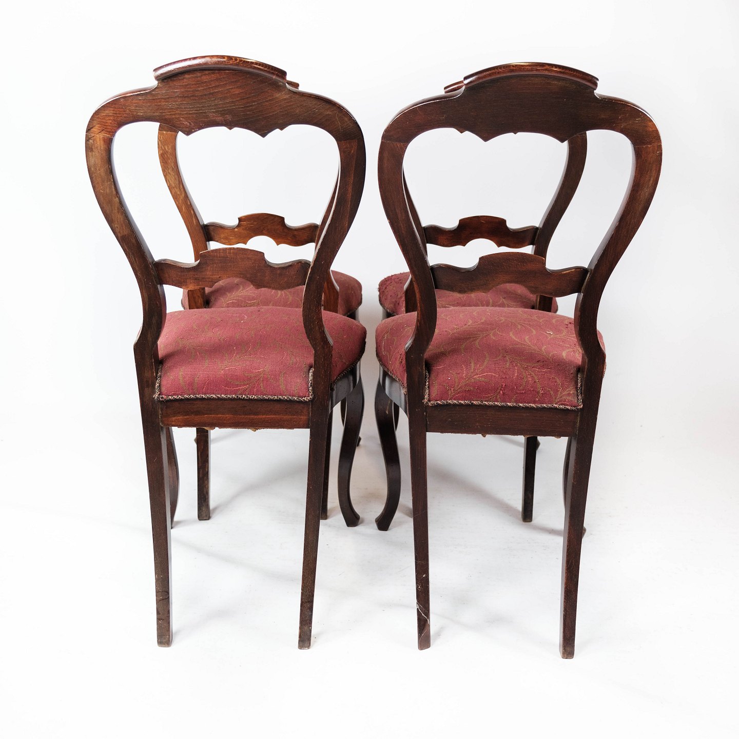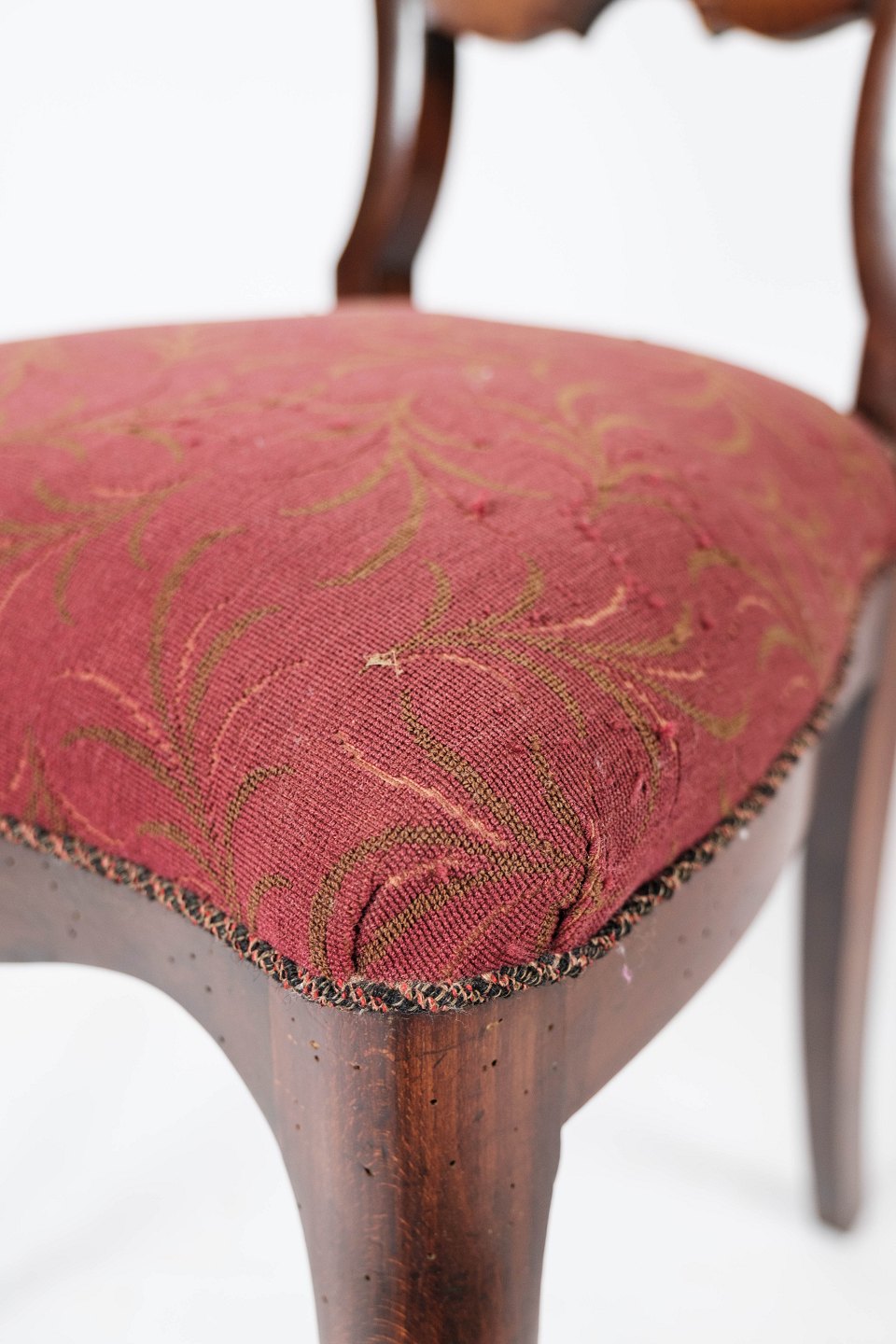 Set of four dining room chair of mahogany and upholstered with red fabric from the 1860s. The chairs are in great antique condition.