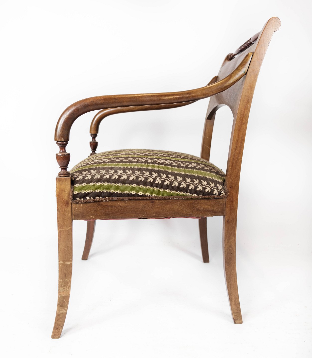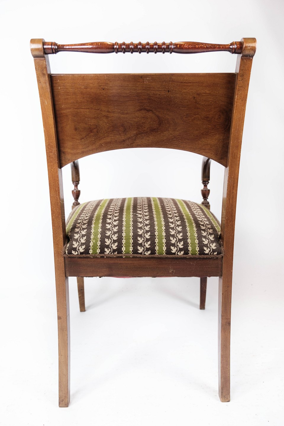 Armchair of polished mahogany and upholstered with green striped fabric from the 1860s.
