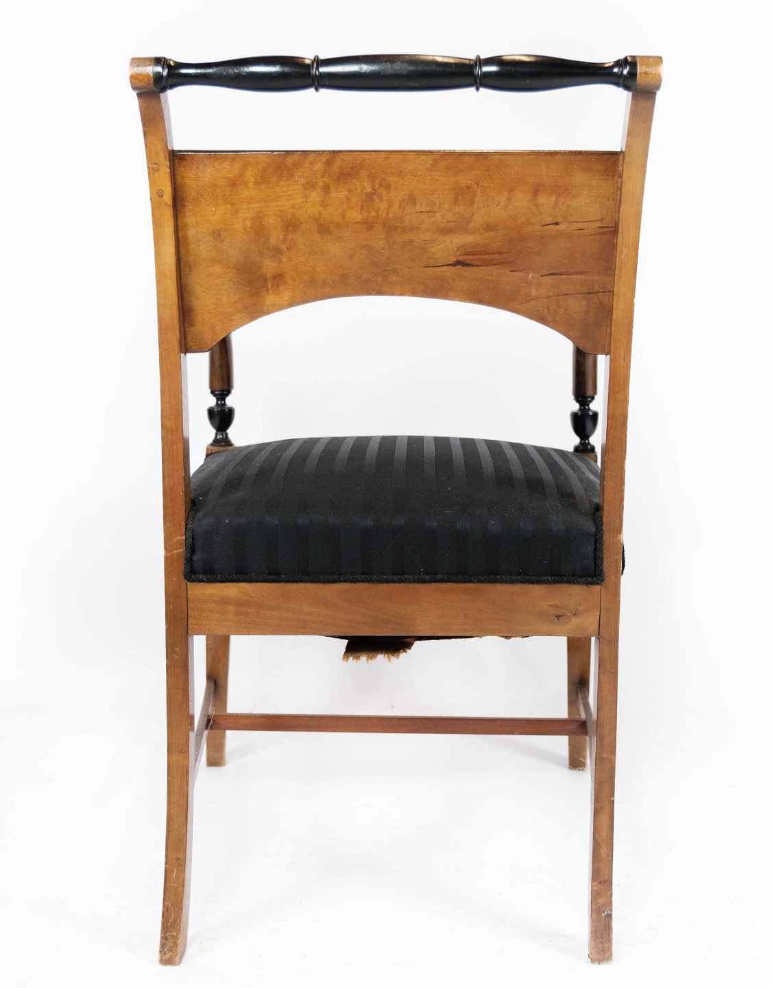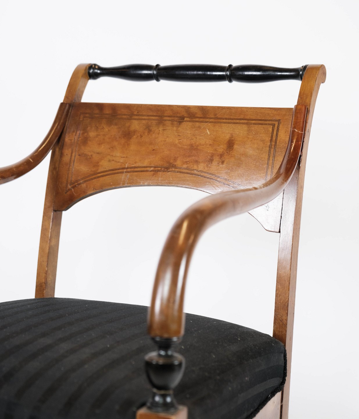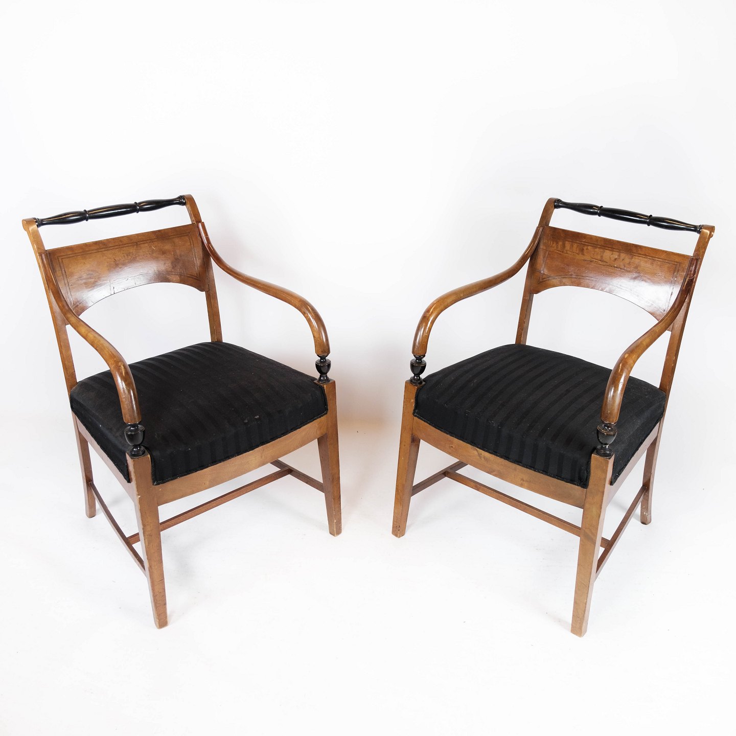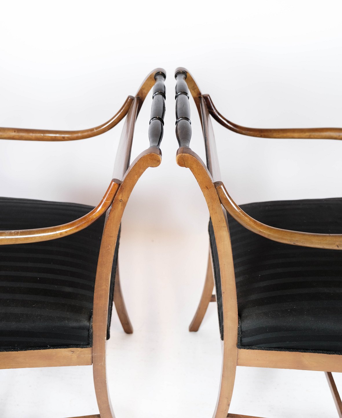 SolgtSæt af to armstole af birketræ og polstret med sort stribet stof, fra 1840erne.