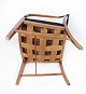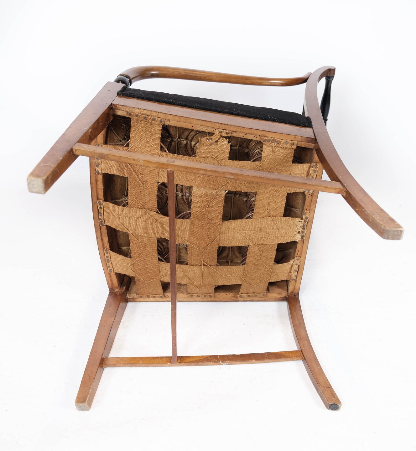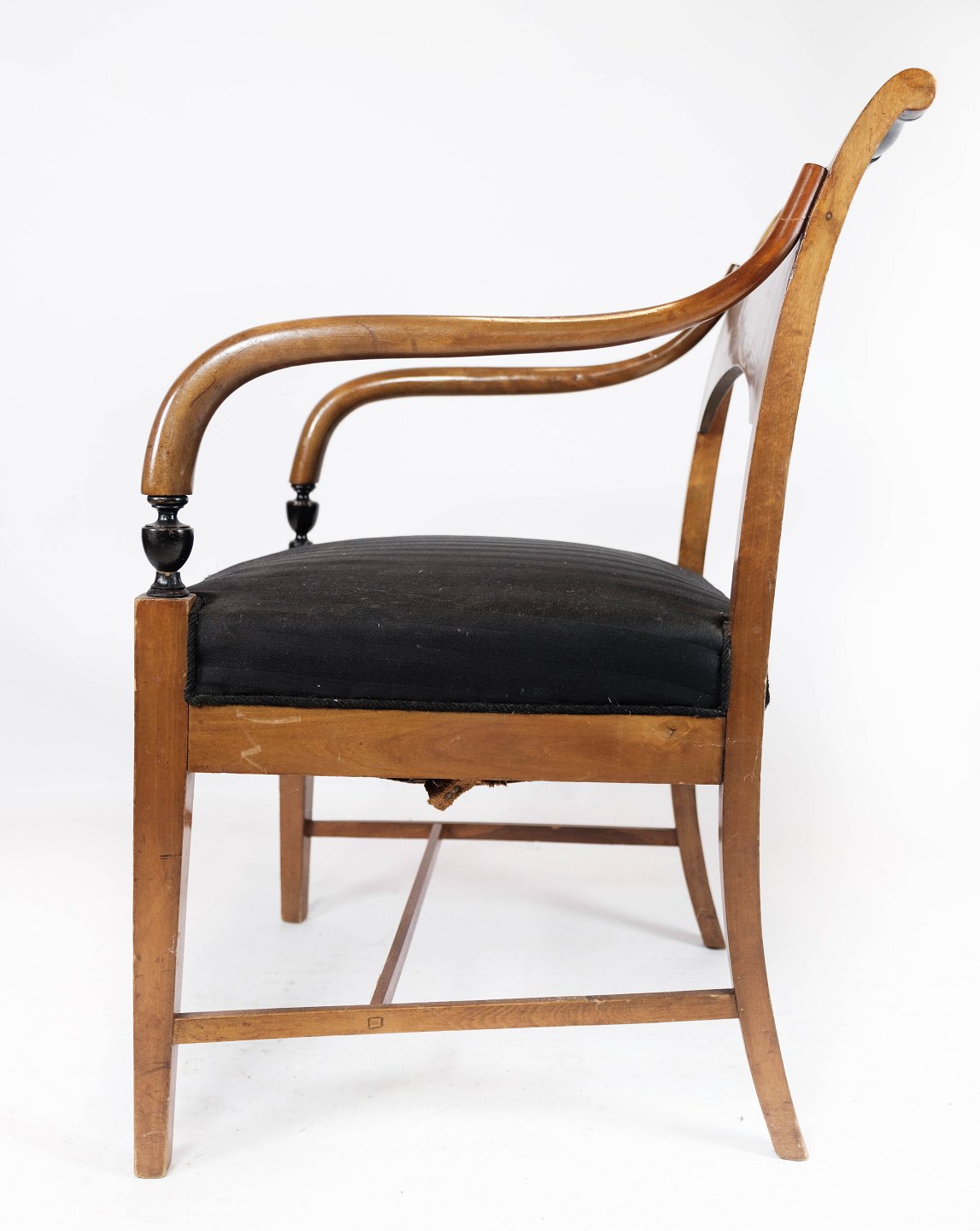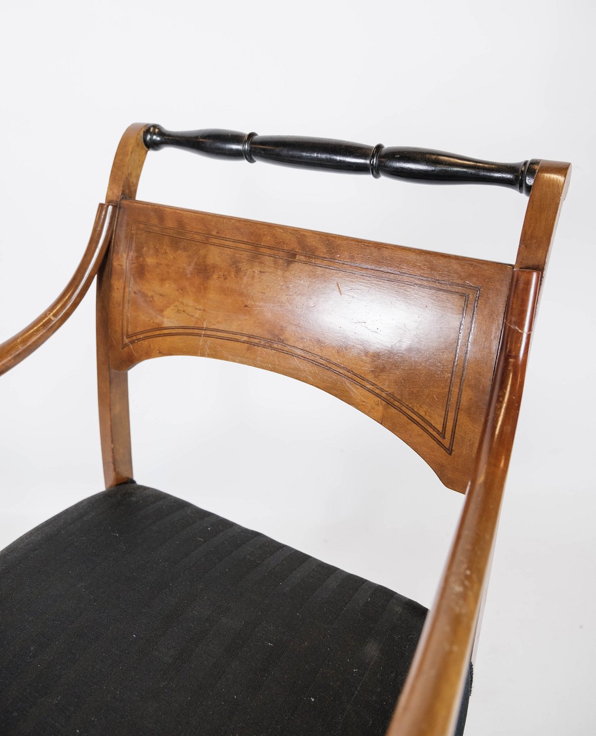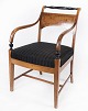 SolgtSæt af to armstole af birketræ og polstret med sort stribet stof, fra 1840erne.