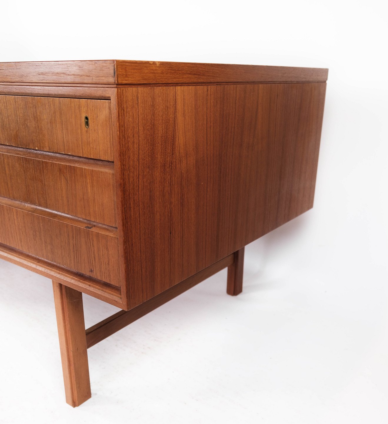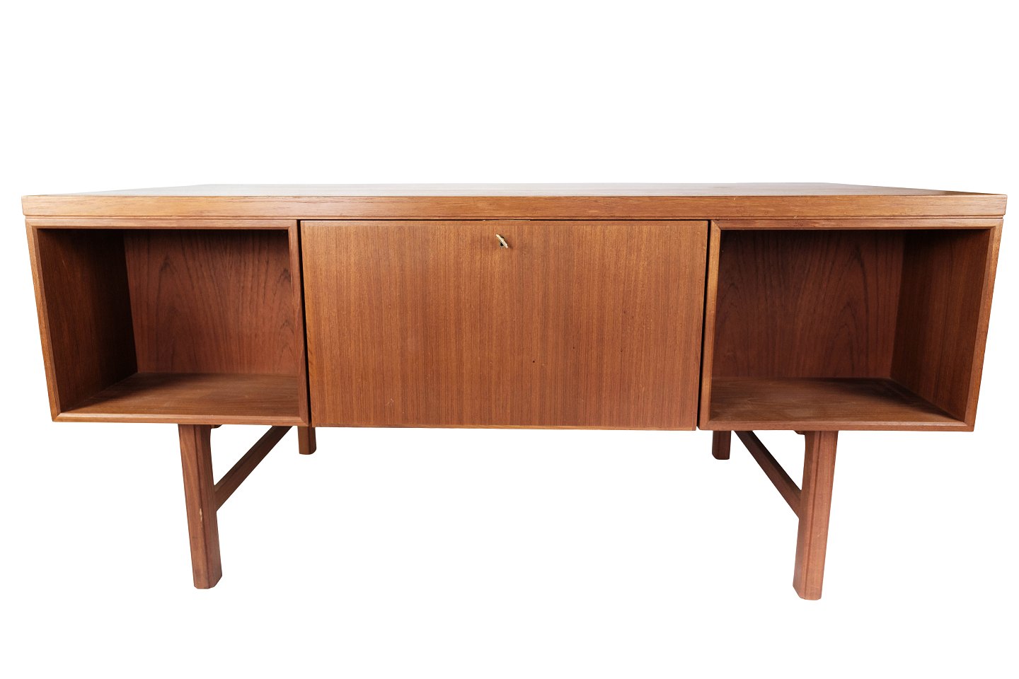 The desk in teak, designed by Omann Junior in the 1960s, is a prominent example of Danish furniture design from that time.