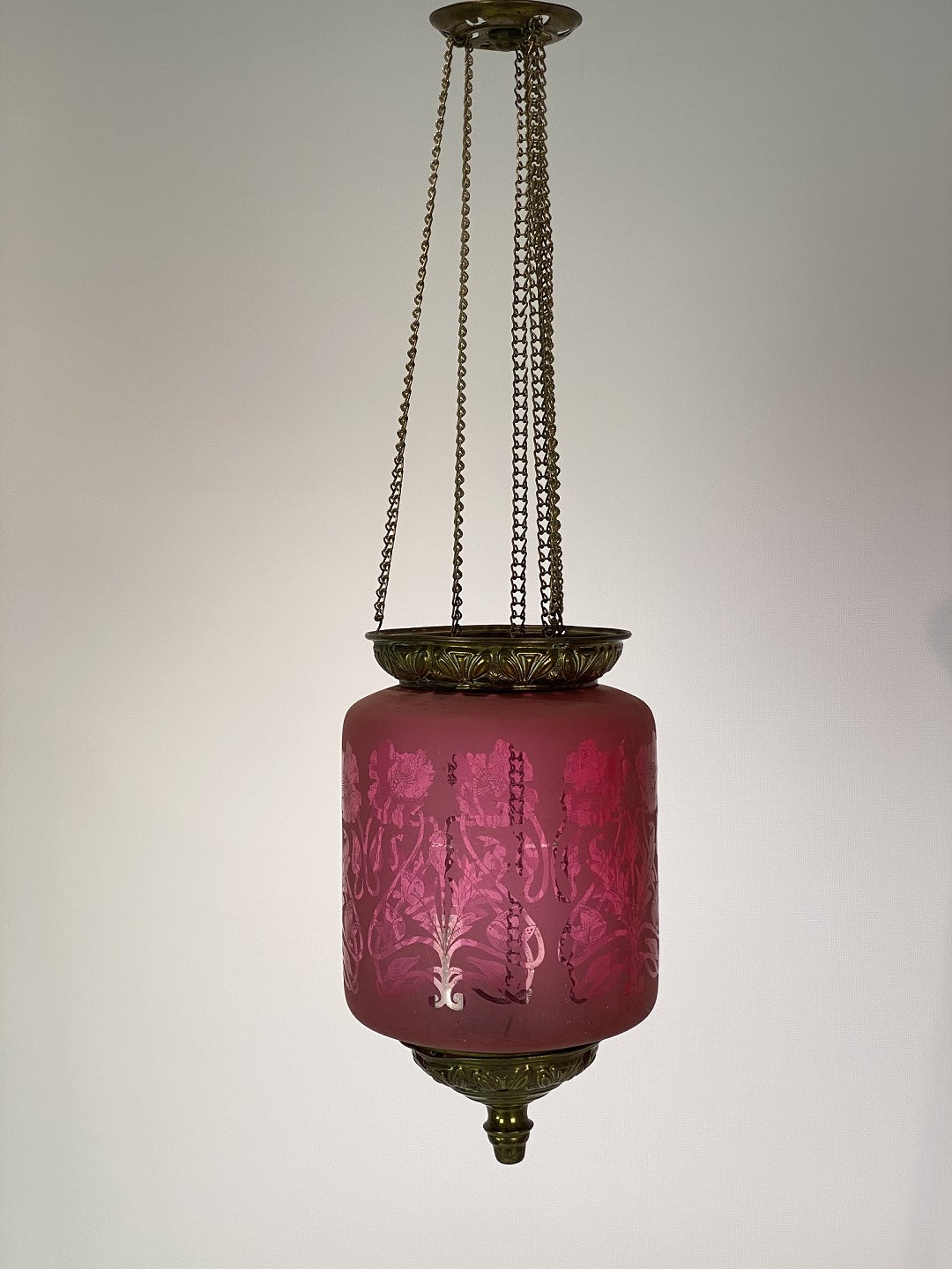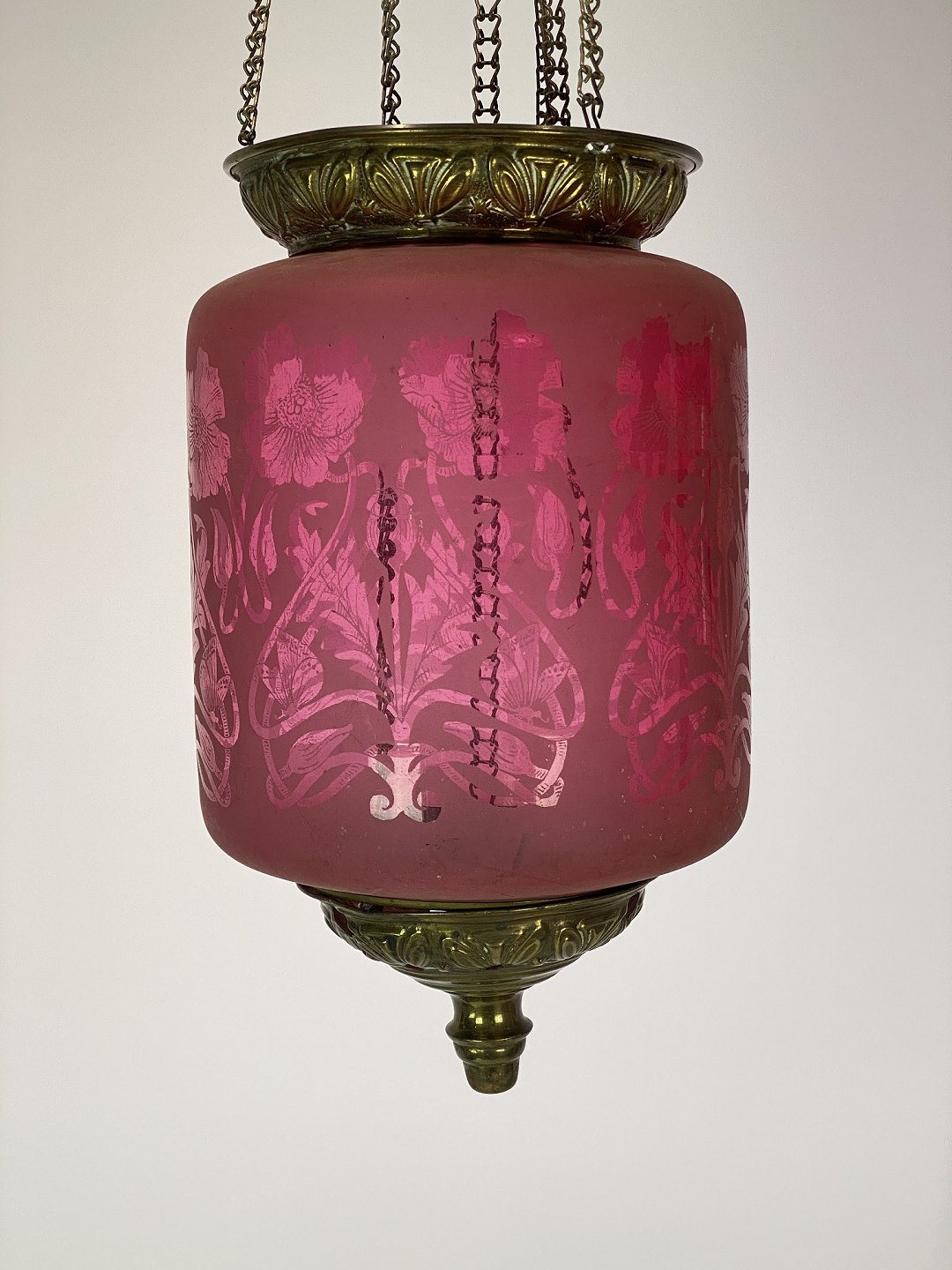 SolgtAntik Ampel med lyserødt opal glas med messing kant og ophæng, af Fyns Glasværk fra 1860erne. Pendlen er i flot antik stand.