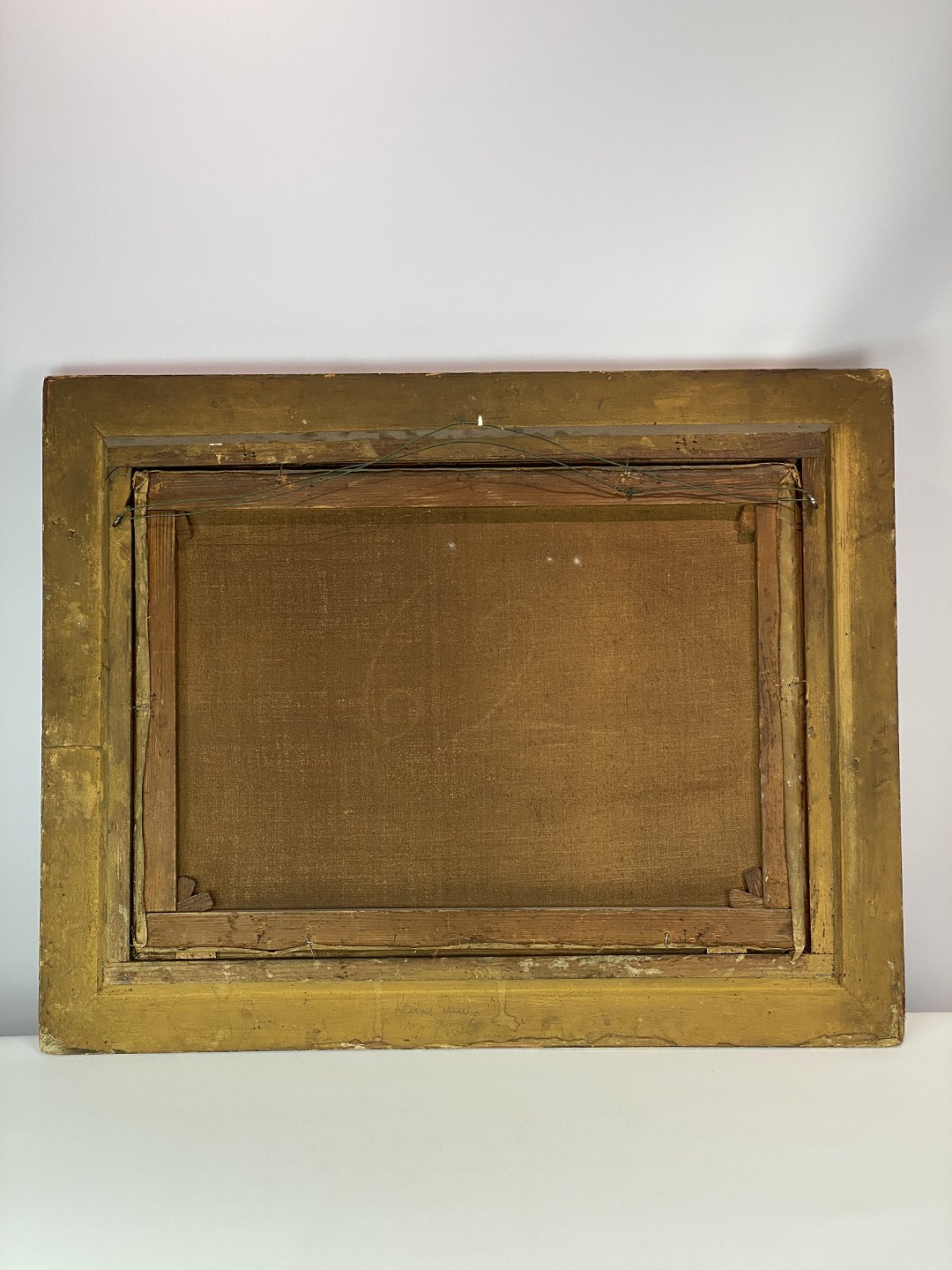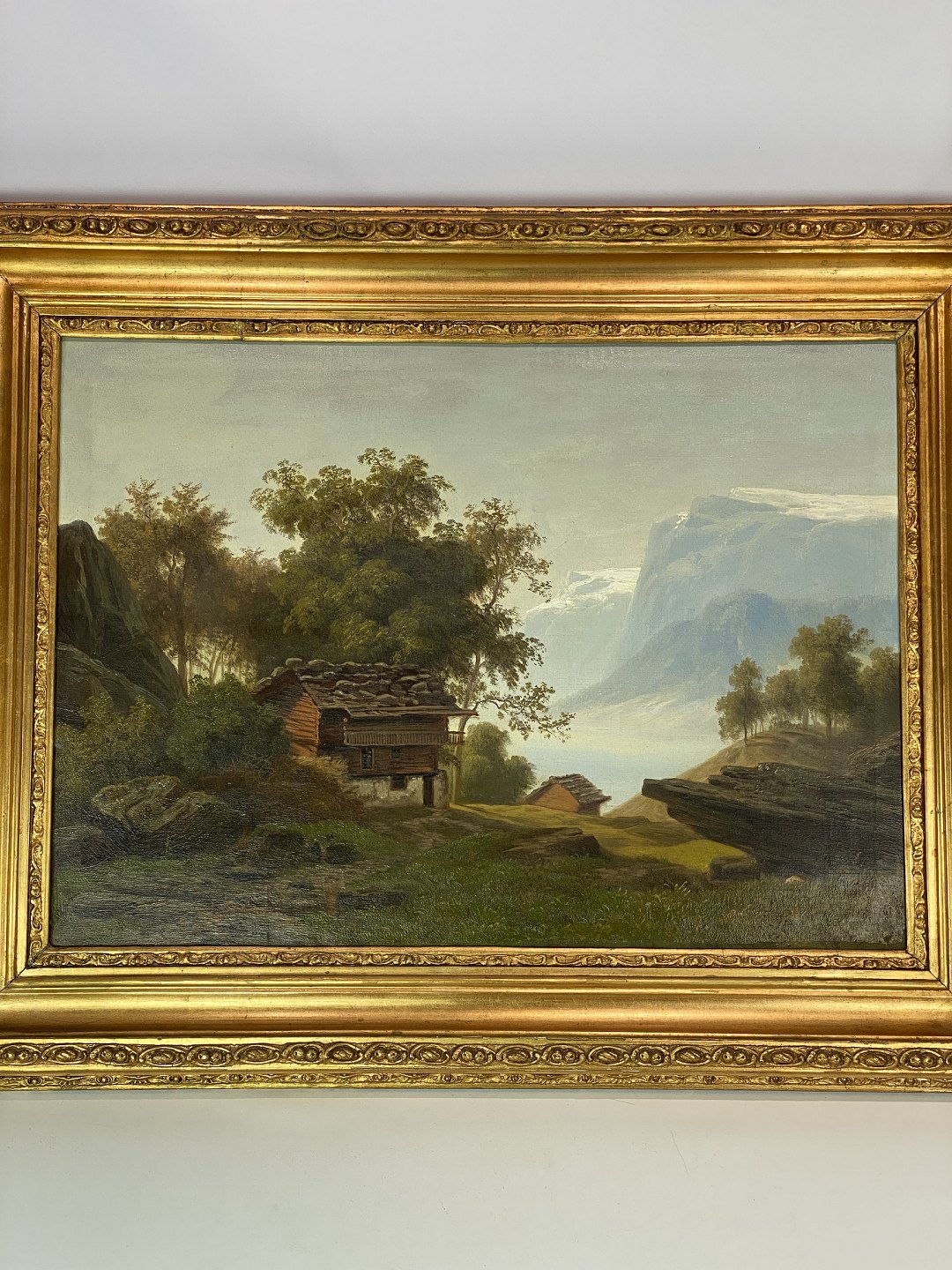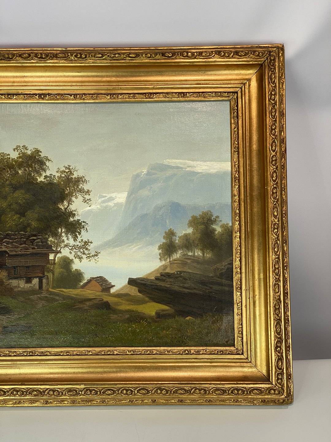 Maleri på lærred med motiv af de Schweiziske alper og med bred forgyldt ramme, fra omkring 1680.
